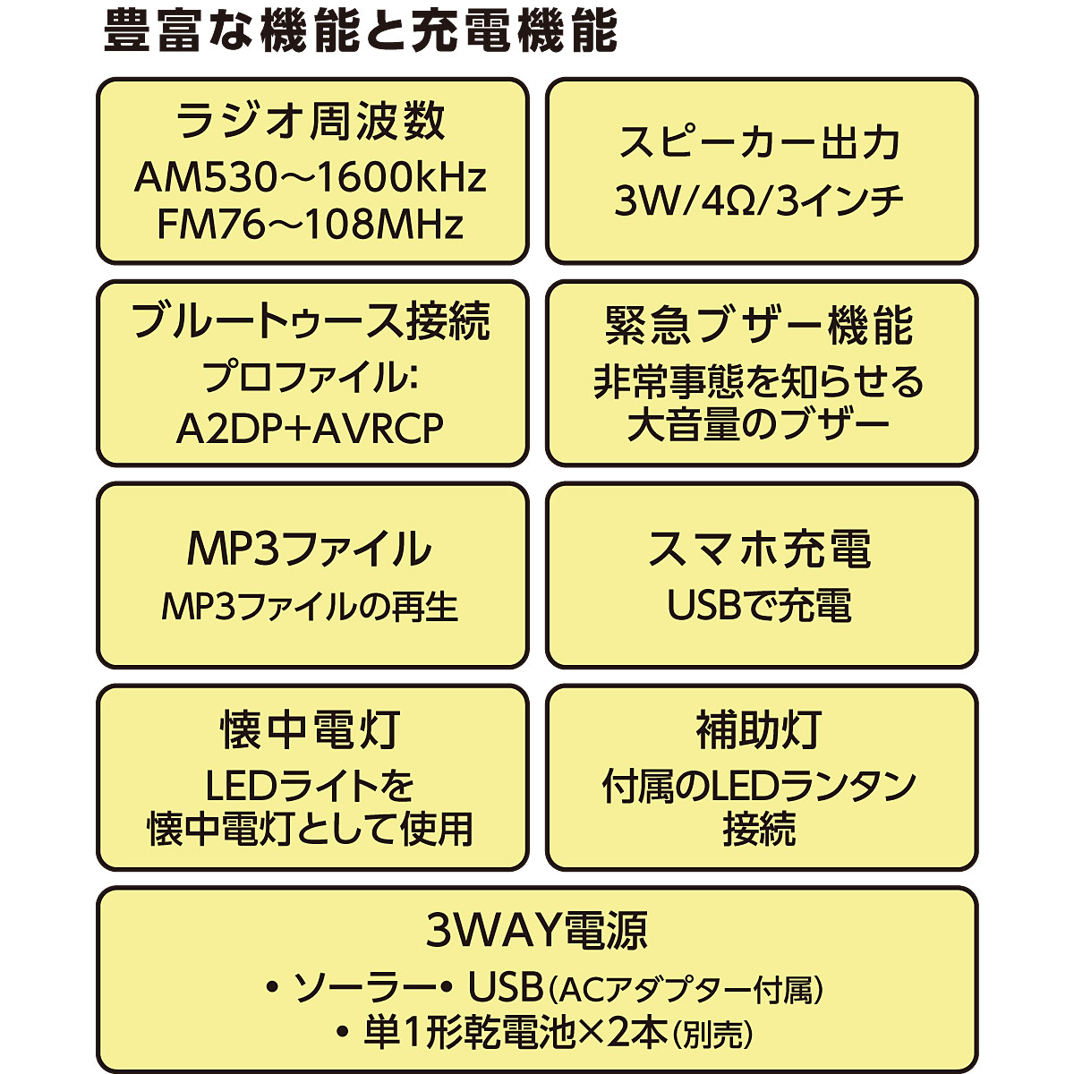 ■サイズ(約cm)/幅16.5×奥行7.0×高さ23.2 ■重量/約768g(乾電池含まず) ■電源/[入力]DC5V/1A(microUSB給電)、単1電池×2本(別売)、ソーラーパネル:6V/2W [出力]リチウムイオン充電池:3.7V/1500mAh、USB 5V・DC4V×3 ●ラジオ周波数:AM530~1600kHz FM76~108MHz ●スピーカー出力:3W/4Ω/3インチ●付属品/USB電源プラグ、USB電源コード、LED電球×1(コード長3m) 【航空便不可】●中国製【返品交換・不可】 【保証書付1年間】(本体のみ)