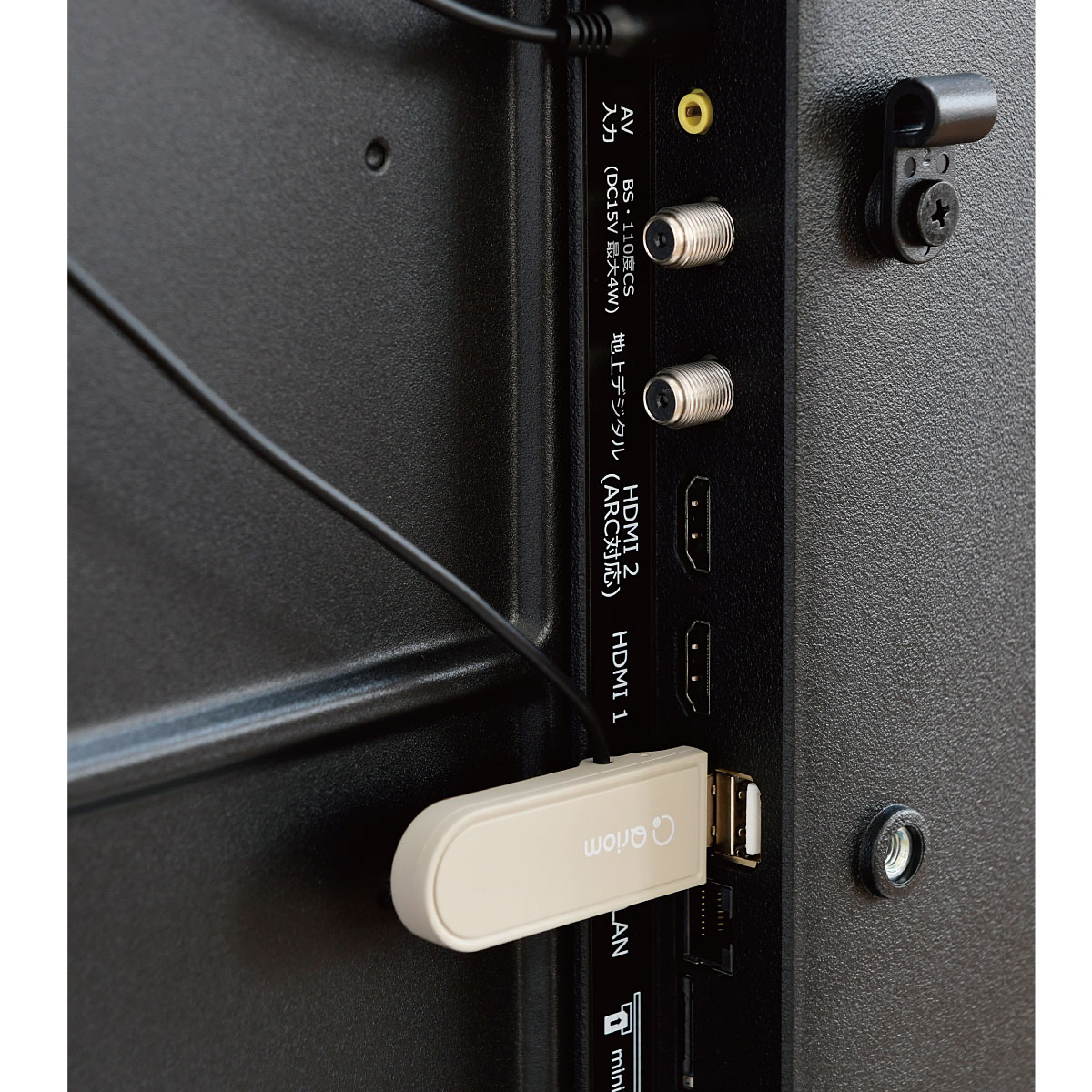 送信機の接続は、テレビで完結。送信機への給電は、テレビからできるので電池もいりません。 ※テレビにUSB端子が無い場合は、付属のACアダプターを使用し、家庭用コンセントから給電可能。