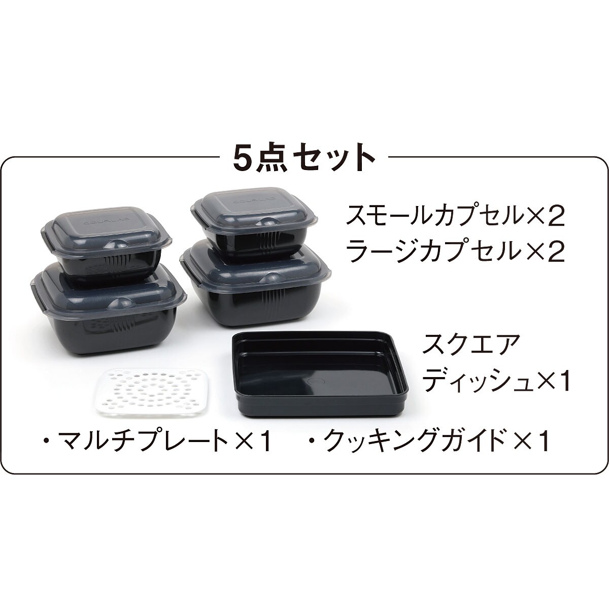 ■[容器の本体・スクエアディッシュ・マルチプレート]スチロール樹脂[フタ]ポリプロピレン■[セット内容]ラージカプセル×2スモールカプセル×2スクエアディッシュ×1マルチプレート×1クッキングガイド×1■サイズ(約cm)/[ラージカプセル]横18.8×縦16.7×高8.9[スモールカプセル]横15.6×縦13.7×高7.2[スクエアディッシュ]横19.9×縦18×高3.2[マルチプレート]横13×縦12×高1■重量(約g)/[ラージカプセル]161g[スモールカプセル]107g[スクエアディッシュ]118g[マルチプレート]22g■容量[ラージカプセル]約1.3L[スモールカプセル]670ml[スクエアディッシュ]900ml■耐熱温度:230℃(フタは150℃)耐冷温度:-40℃●日本製