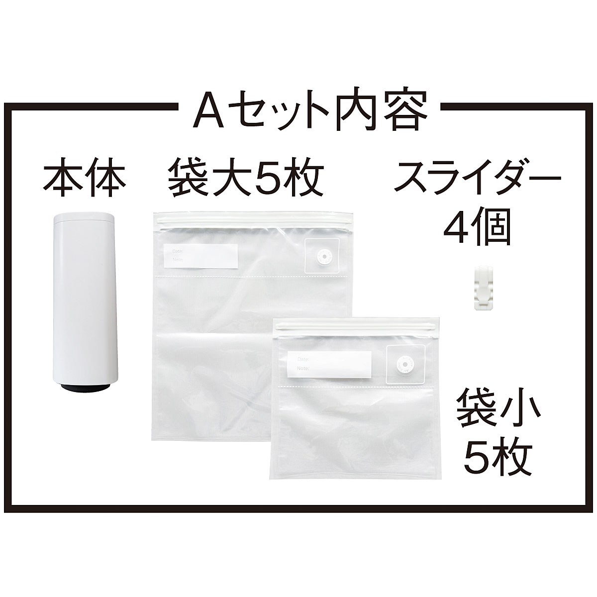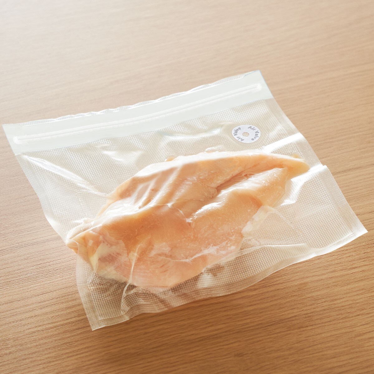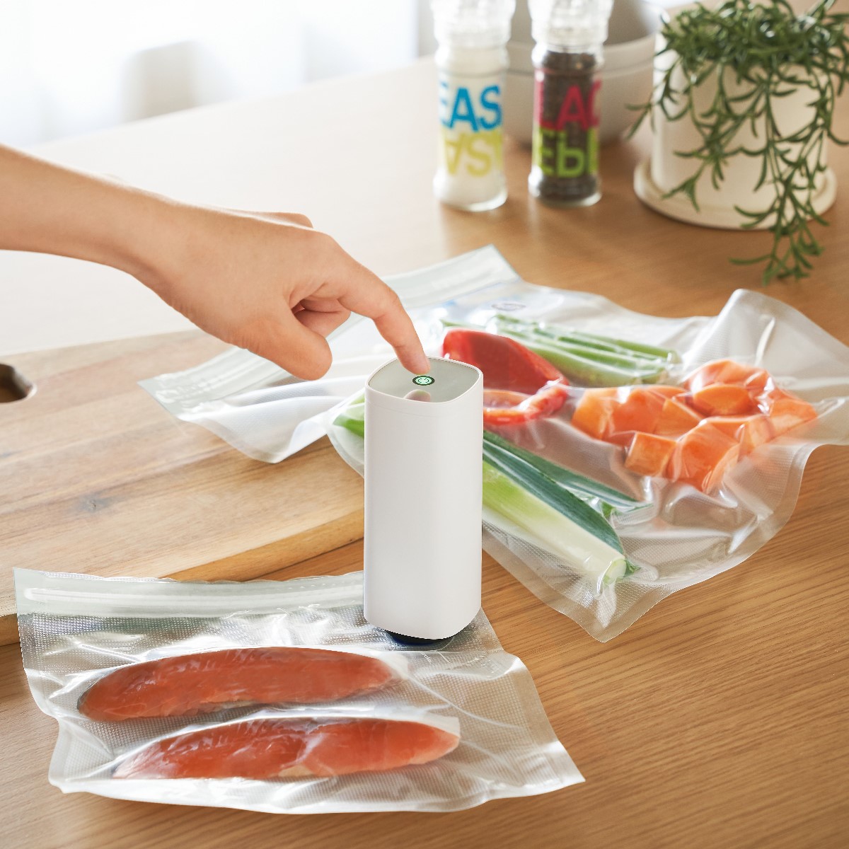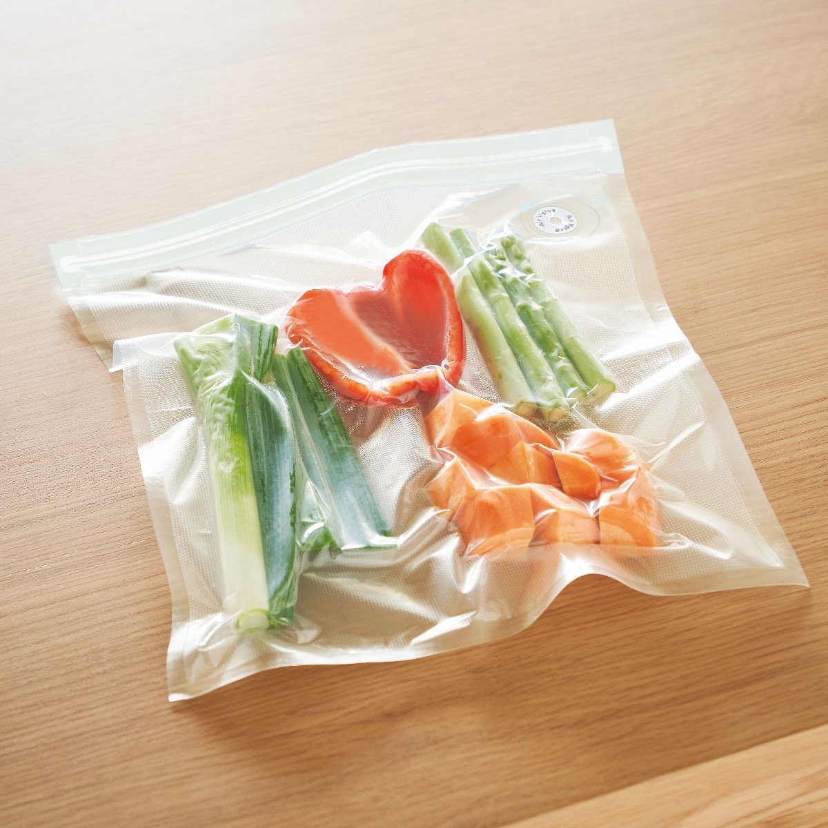 専用の吸引機が袋の中の空気を抜いて密閉状態に。真空状態で酸化を防ぐから、野菜の鮮度も長持ちします。まとめ買いした食品を便利な小分けにして保存できます。そのまま湯せんもでき、時短料理にも活躍。