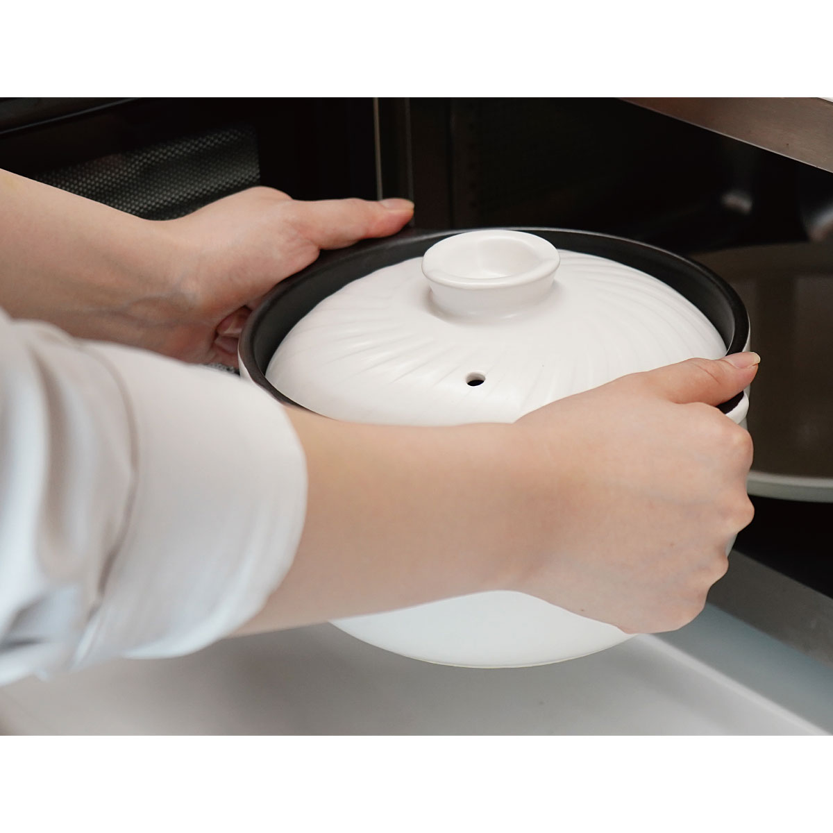 加熱後は蓄熱性の高い陶器製の鍋が、余熱調理でふっくらしっとりと仕上げてくれます。白米はもちろん、玄米やお粥、炊き込みご飯などの炊き方もわかるレシピ付き。フタと鍋だけのシンプルな構造で、お手入れもラクラクです。2合分なので丁度良いサイズで、そのまま食卓に出してもおしゃれなデザイン【炊飯時間目安】電子レンジ1合:500Wで約10分程度加熱2合:500Wで約13分程度加熱ガスコンロ1合:弱火で約15分程度加熱2合:弱火で約17分程度加熱