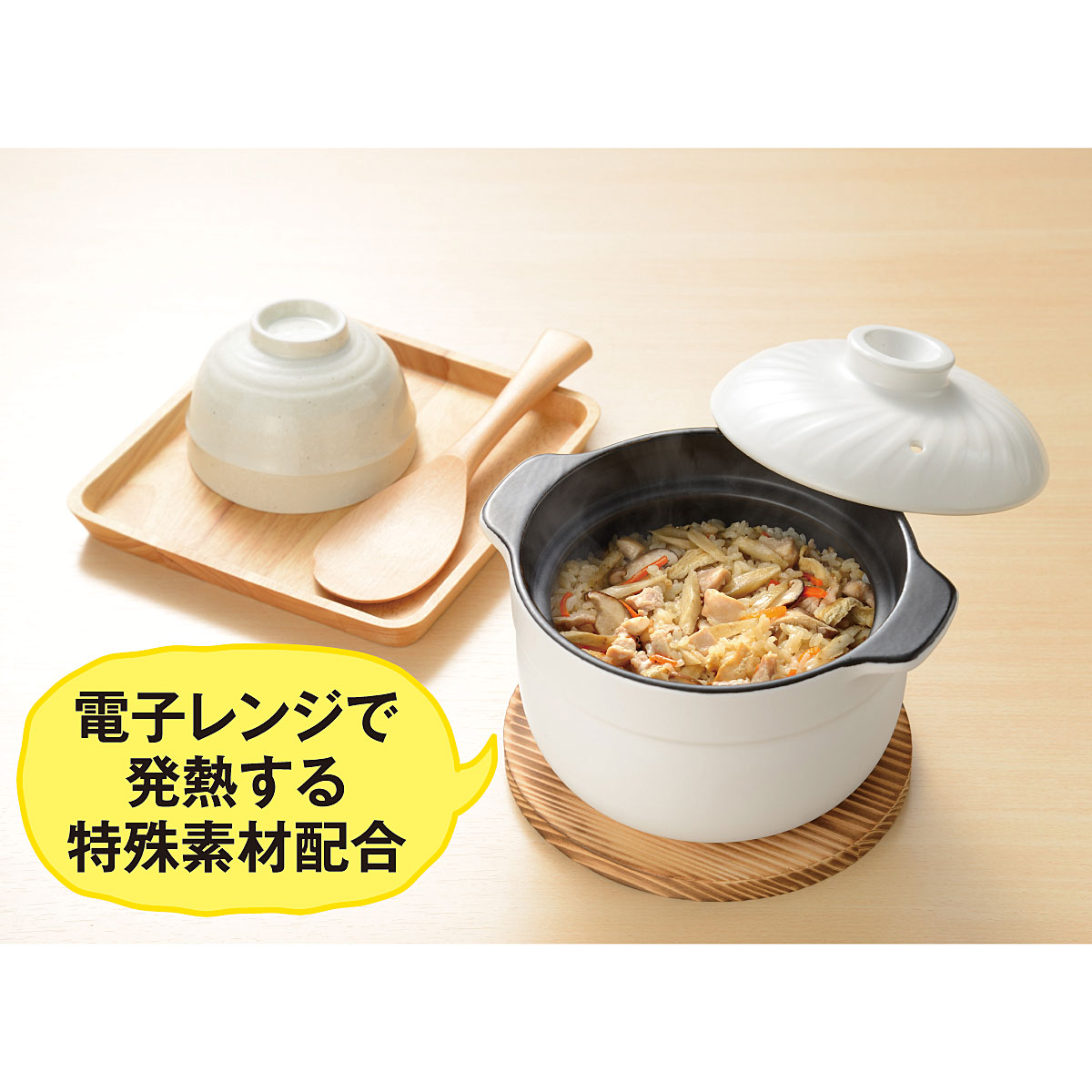 ■[本体]耐熱陶器■サイズ(約cm)/21×17×高さ13.5(フタ有)■重量/約1.3kg■最大炊飯容量/0.36L(2合)■使用可能熱源/ガス、電子レンジ※表記の調理時間は目安です。使用する器具や環境によって調理時間は多少異なります。●中国製●炊き方レシピ付き