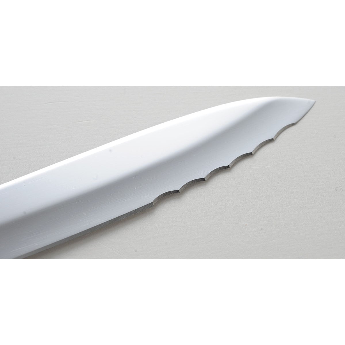 波刃と直刃の2種類の刃の組み合わせにより、パンの切りくずを抑えながらきれいに切り分けられるパンナイフです。波刃のきっかけにより硬いフランスパンも、なかなか刃が入らずに潰れやすい柔らかい食パンも簡単に切れます。波刃は刃先と刃元部分にあるので、押し切り・引き切りのどちらの切り方もできます。刃は特殊鋼材を使用し、こだわりの切れ味を実現。見た目の美しさと同時に摩擦を減らし切れ味をアップさせた鏡面仕上げです。刃渡り23.5cmと長く、色々な大きさのパンやホールのケーキにも便利です。