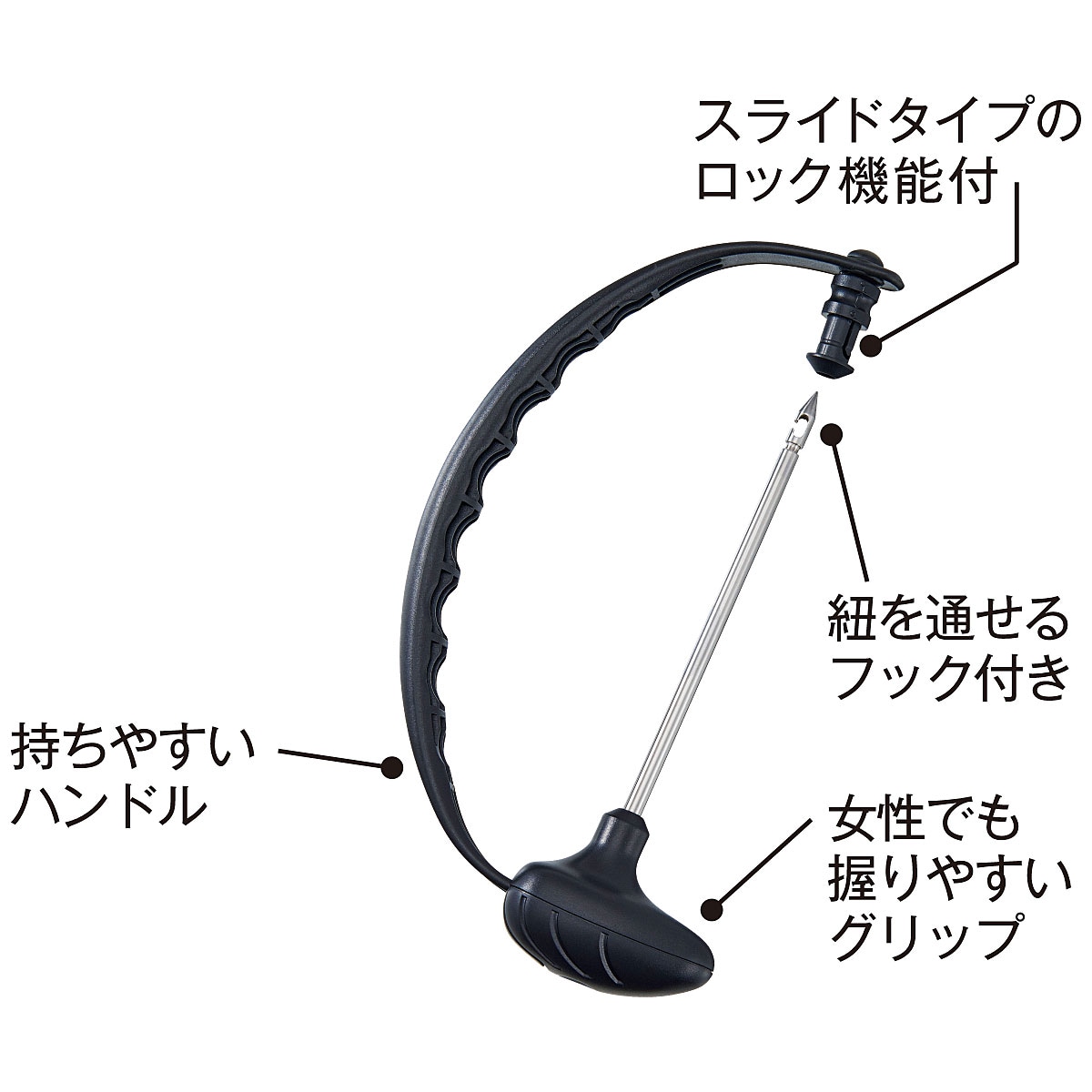 スライドタイプのロック機能付 紐を通せるフック付き 持ちやすいハンドル 女性でも握りやすいグリップ