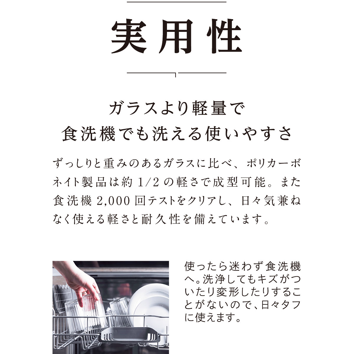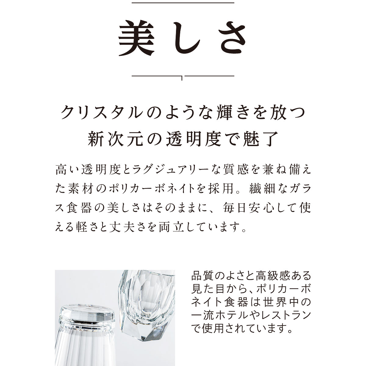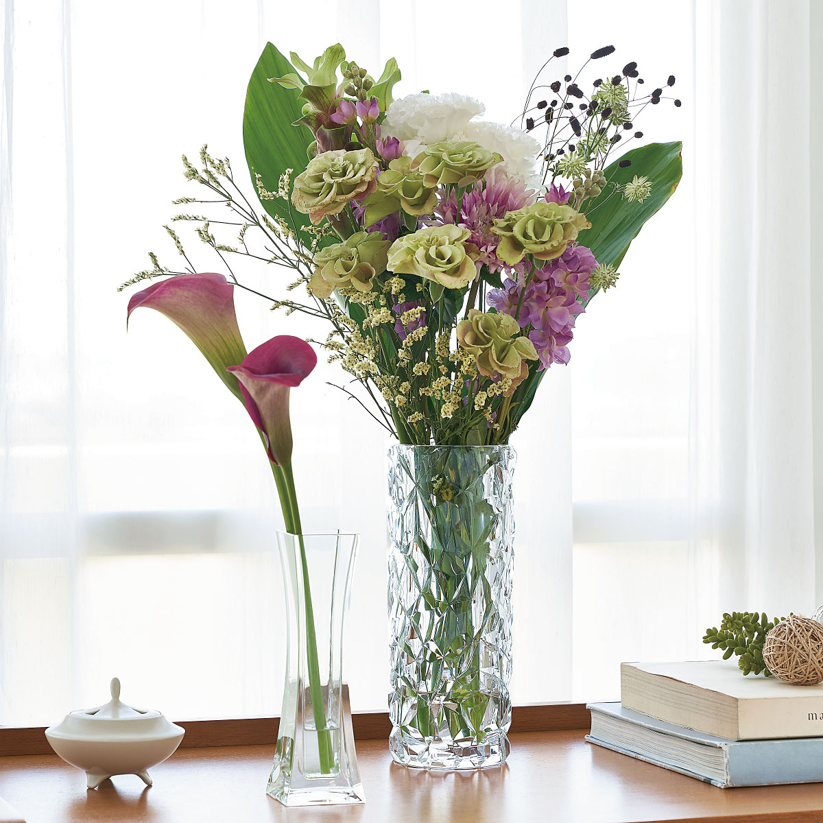 お子様やご年配の方がいるご家庭でも、ガラスの美しさをあきらめない!高い透明度とラグジュアリーな質感を兼ね備えた素材のポリカーボネイトを採用。リビングや玄関先に花を。ガラスの美しさに輝きます。軽いので、水替えも楽。つい、うっかり落としても割れる心配がないので、安心です。