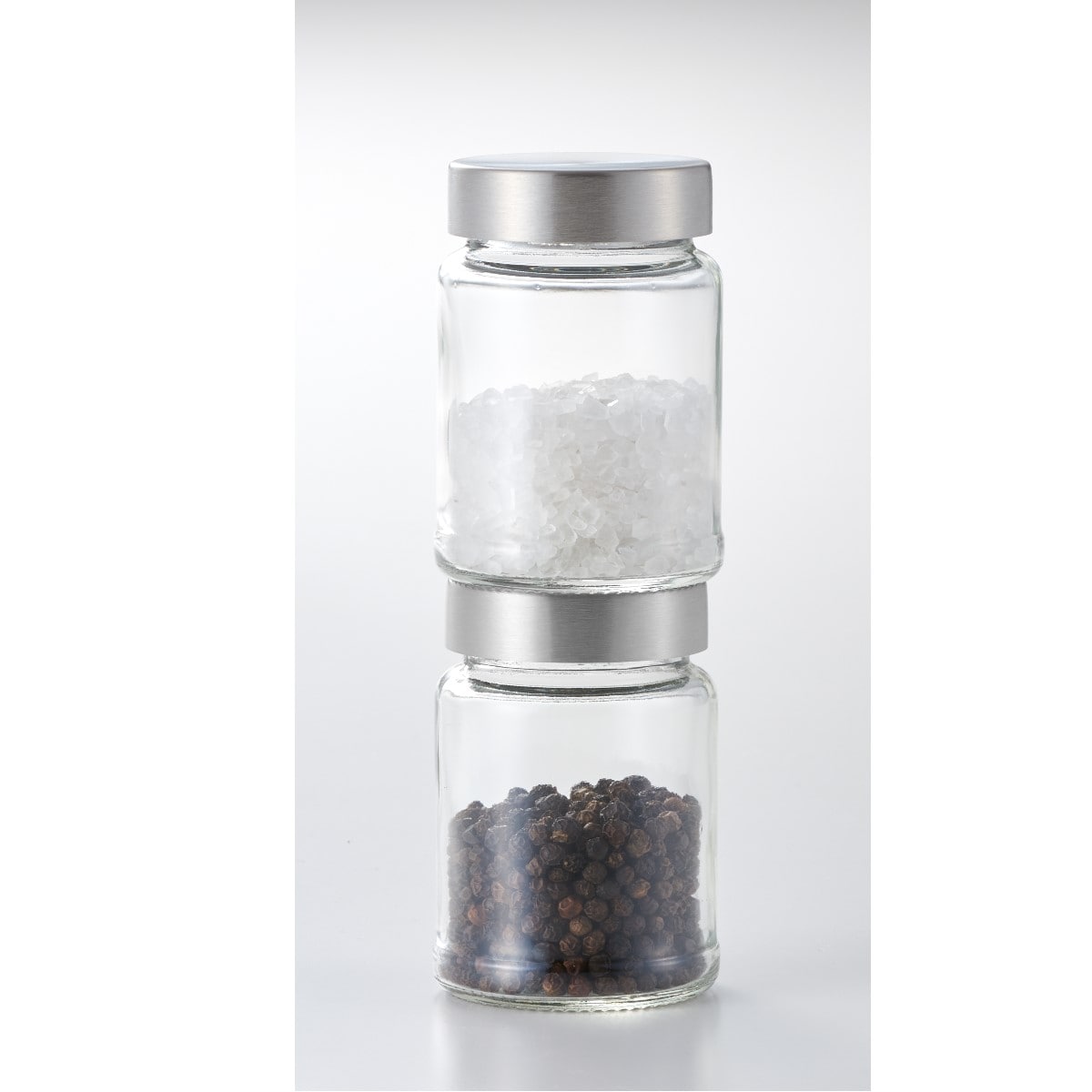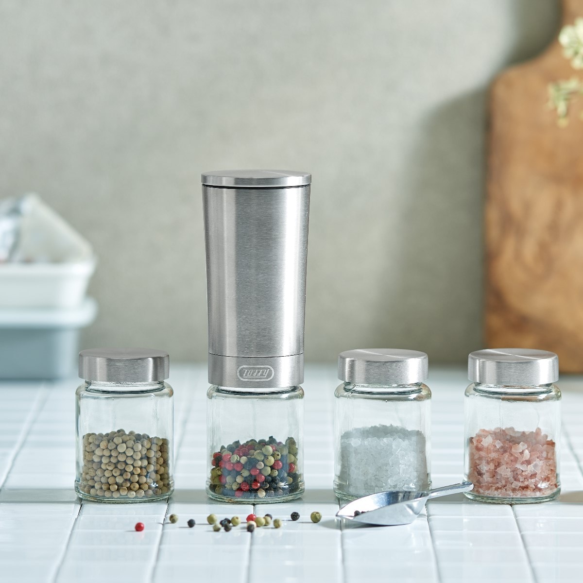 ■[ボトル]ガラス [ふた]ステンレス、ポリプロピレン ■サイズ(約cm)/直径5.5×高さ8 ■重量/120g(1個あたり)■容量/約100mL ※こちらは詰替え用ボトルのみです。本体はWF-6184 Toffy 電動ソルト&ペッパーミルです。※食洗機・電子レンジ不可●中国製