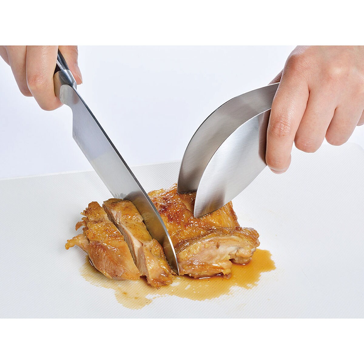 熱々のチキンもしっかりと押さえて切ることができます。