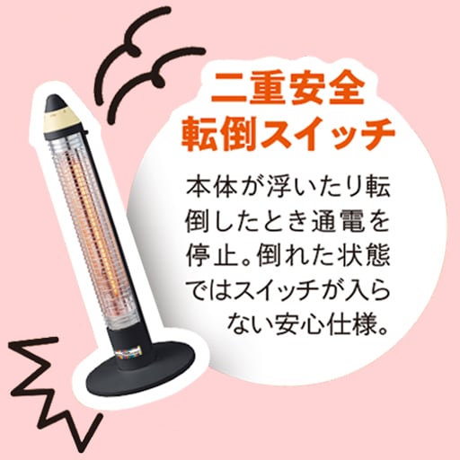 本体が転倒したときに自動で通電を停止してくれる機能付き。