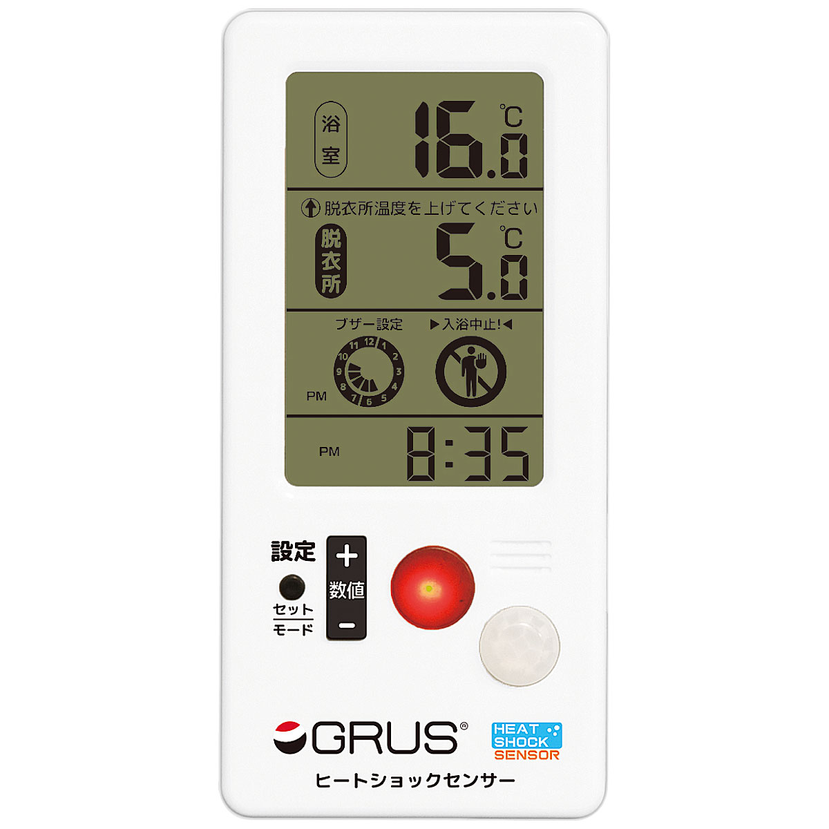 お風呂場と脱衣場の温度差を感知!設置方法は、スタンド・壁掛・磁石の3通り。~ヒートショック対策してますか?~高齢者・高血圧の方・不整脈の方に、温度差による危険を音・光・表示でお知らせします。人を感知して警告音が作動する設定も可能。入浴前のチェックでヒートショックの危険から家族を守りましょう。