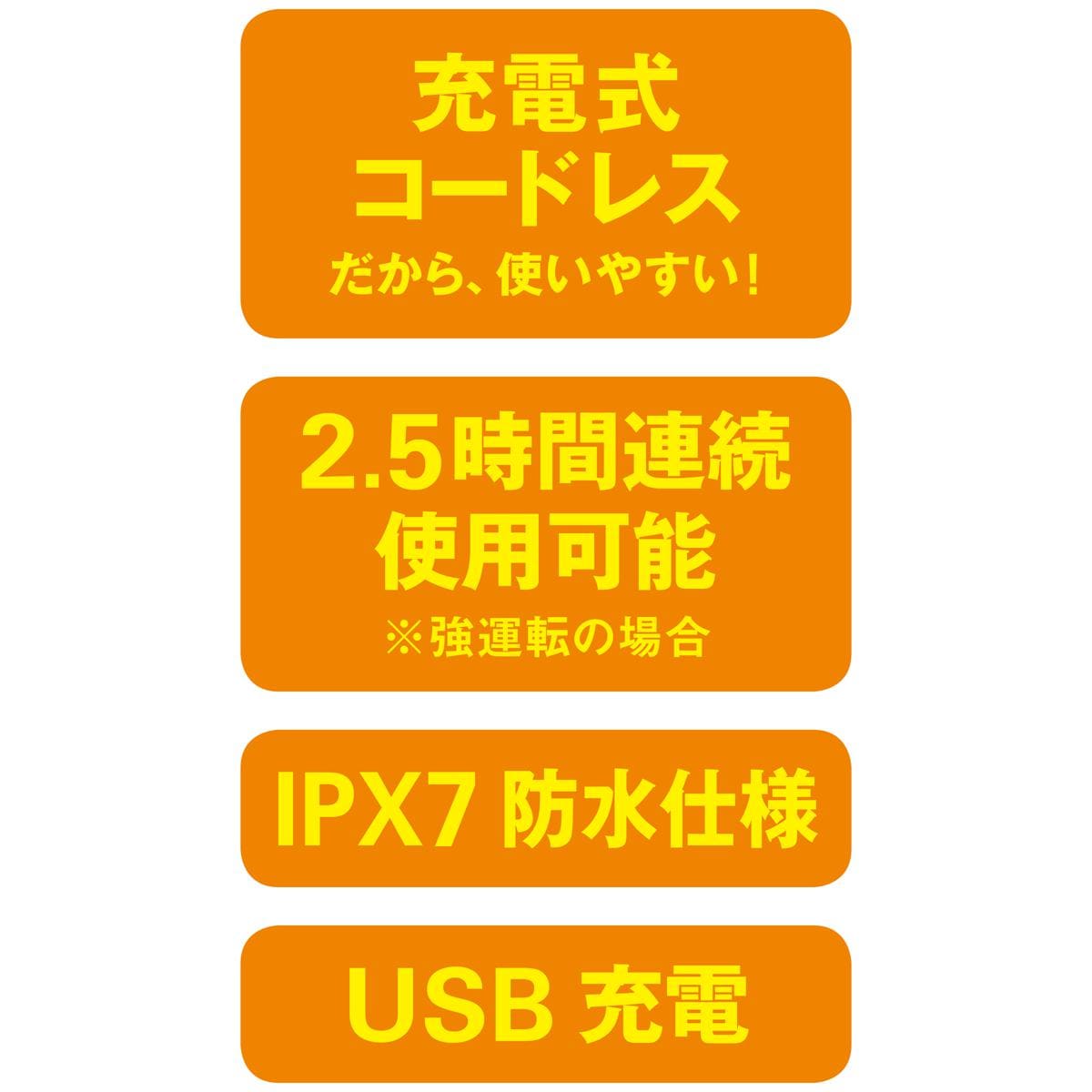 ■[本体]ABS樹脂[アタッチメント]ABS樹脂、ナイロン、ポリプロピレン、ポリウレタン■サイズ(約cm)/19×11×7■電池容量/1,500mAh■回転力/回転2段階(弱/強)■防水性能/IPX7■連続使用時間(約)/[強]2時間30分[弱]2時間50分■セット内容/交換ヘッド(ブラシ・ハードスポンジ・ソフトスポンジ)、USB充電ケーブル※コンセントに接続するには別売のACアダプタが必要です。※商品の特性上、返品・交換はお受けできません。●中国製