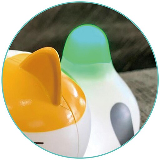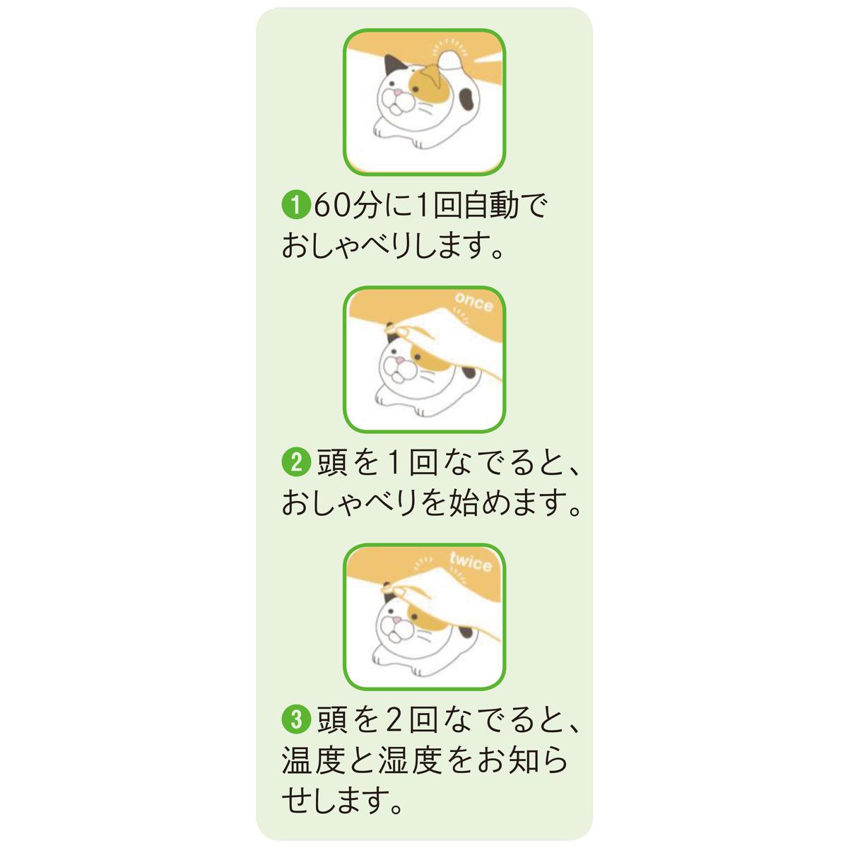 60分に1回自動でおしゃべりします。頭を1回なでると、おしゃべりを始めます。頭を2回なでると、温度と湿度をお知らせします。