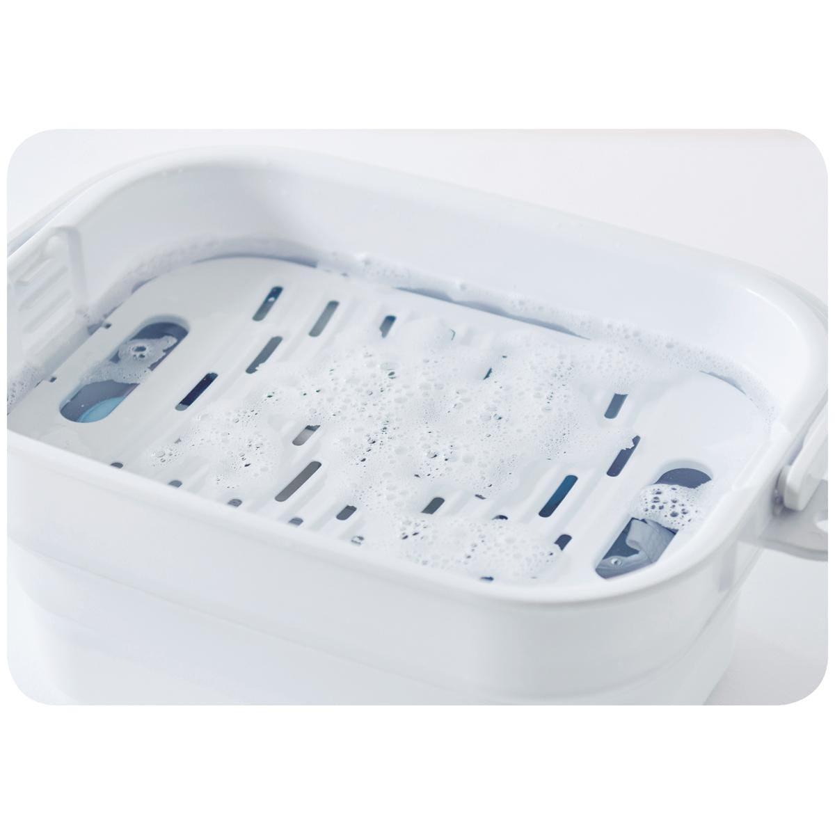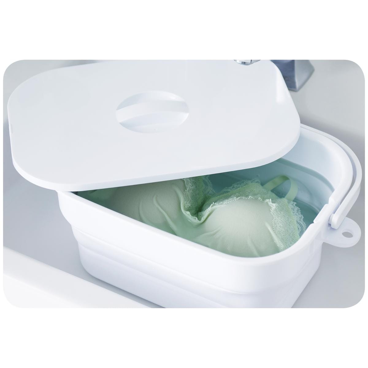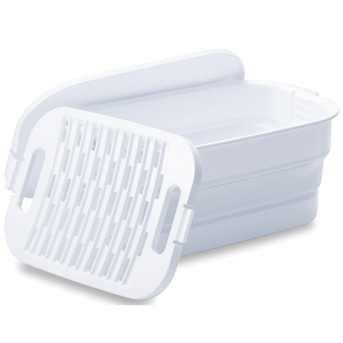 つけ置き時に洗濯物が浮き上がらない中フタ付き!洗濯物の量に合わせて位置の調整も可能です。洗濯板も兼ねた中フタは、ひどい汚れの事前洗いや部分洗いに活躍。未使用時は折り畳んでコンパクトに収納!