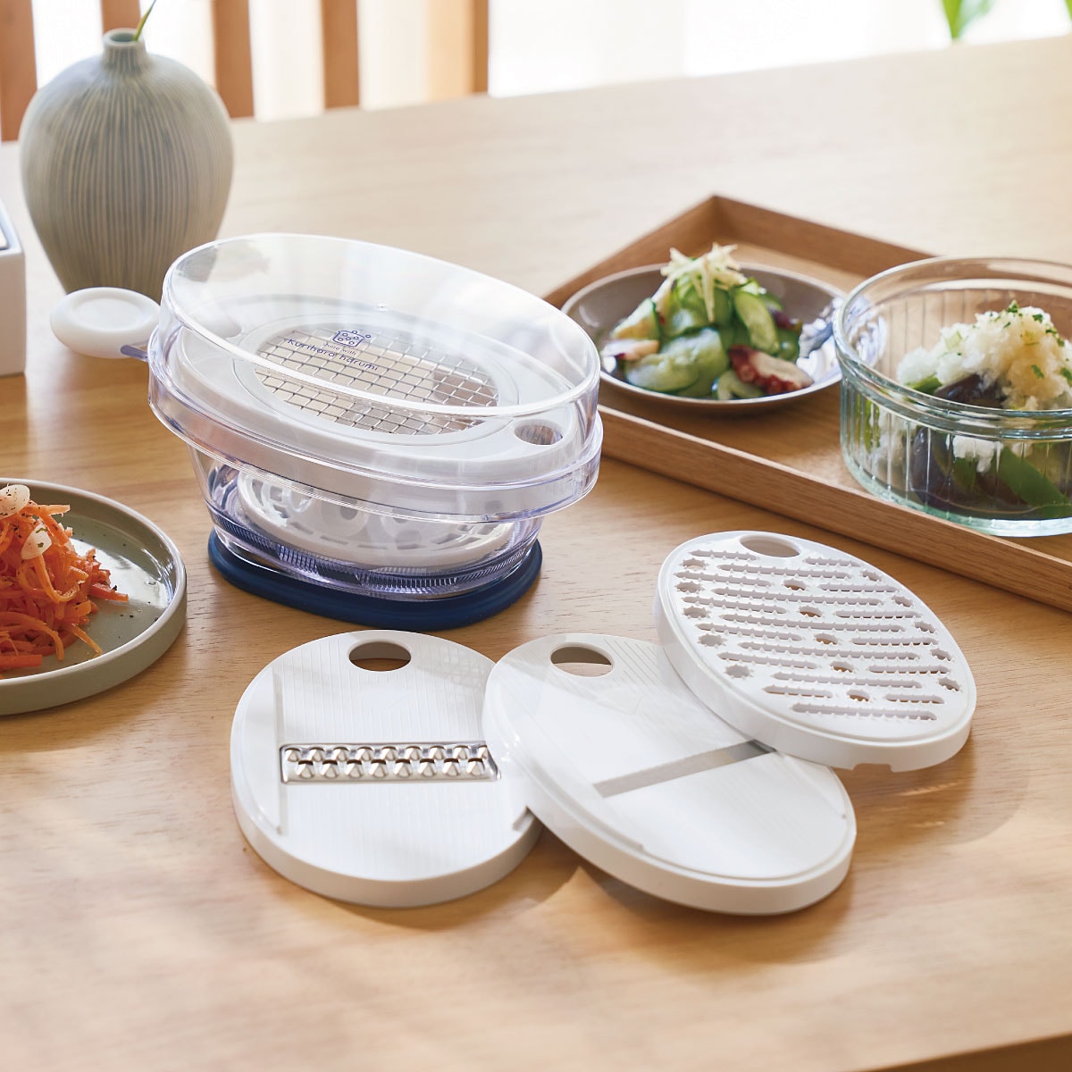コンパクトなのにこれ1台で何役もこなす便利なスライサーセット♪おかずを手早く作れるアイテムをコレひとつに。