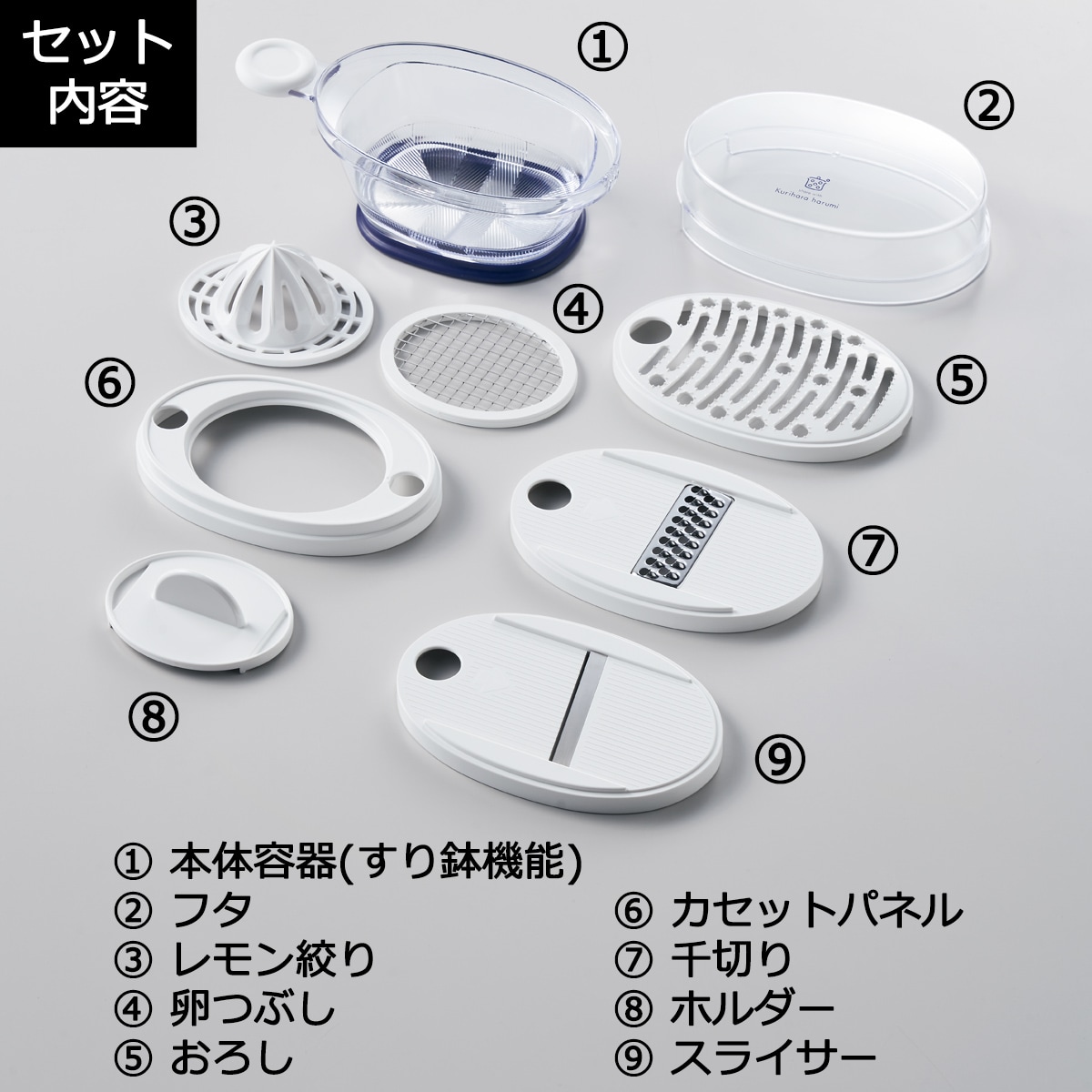 ■[本体容器・レモン絞り]AS樹脂 [スライサー]ABS樹脂、ステンレス刃物鋼 [千切り]本体:ABS樹脂、刃:18-0ステンレス [卵つぶし]ABS樹脂、18-8ステンレス [おろし・カセットパネル・ホルダー]ABS樹脂 [フタ]スチロール樹脂 [底滑り止め・取っ手滑り止め]熱可塑性エラストマー ■サイズ(約cm)/縦20.2×横11×高さ11(フタ含む) ■満水容量/約300mL ■セット内容/スライサー、千切り、おろし、レモン絞り、卵つぶし、フタ、本体容器、ホルダー、カセットパネル ●食洗機使用不可●日本製