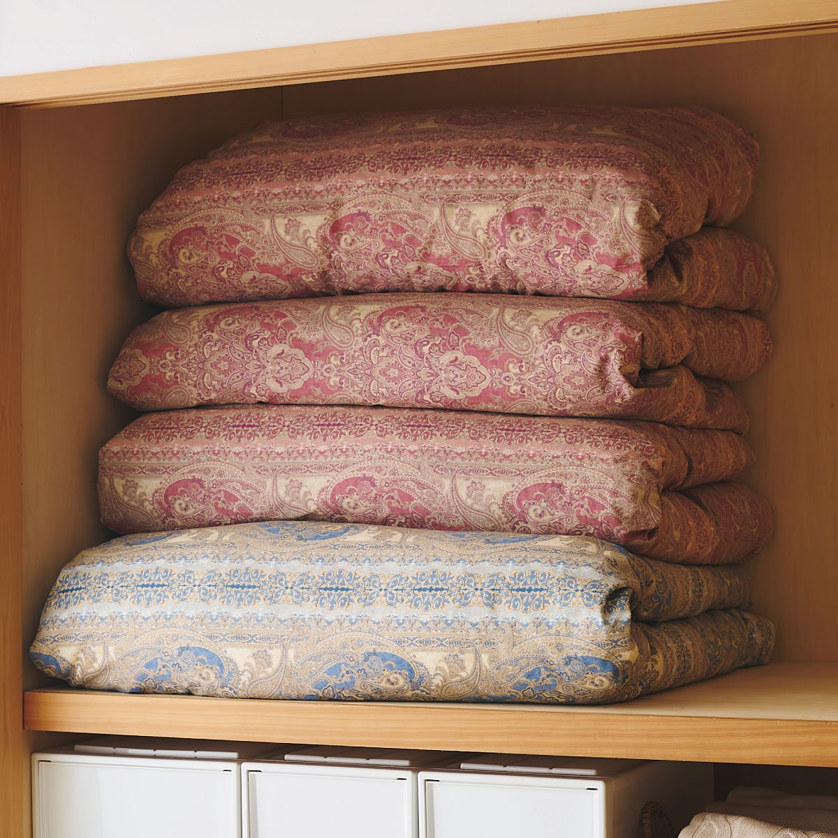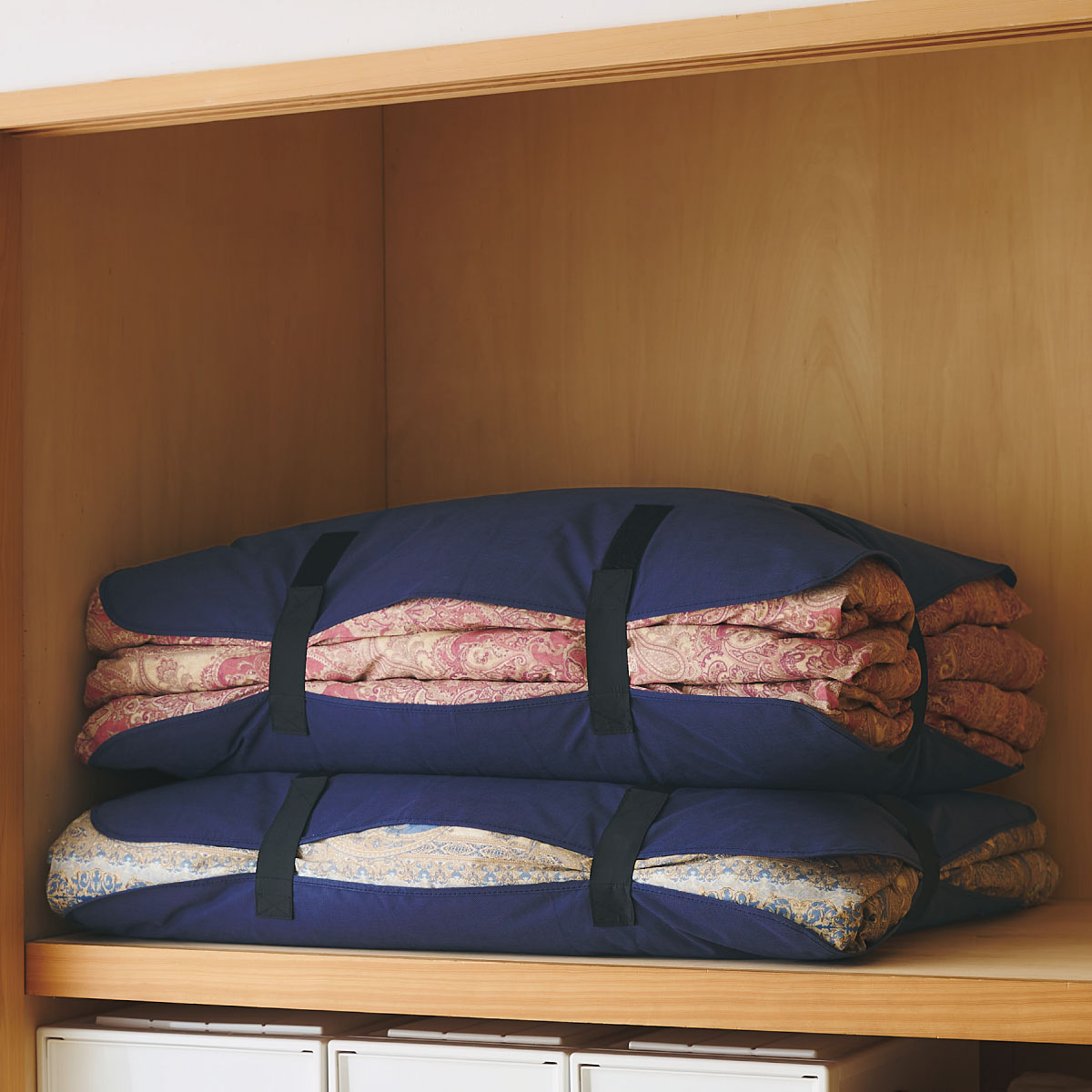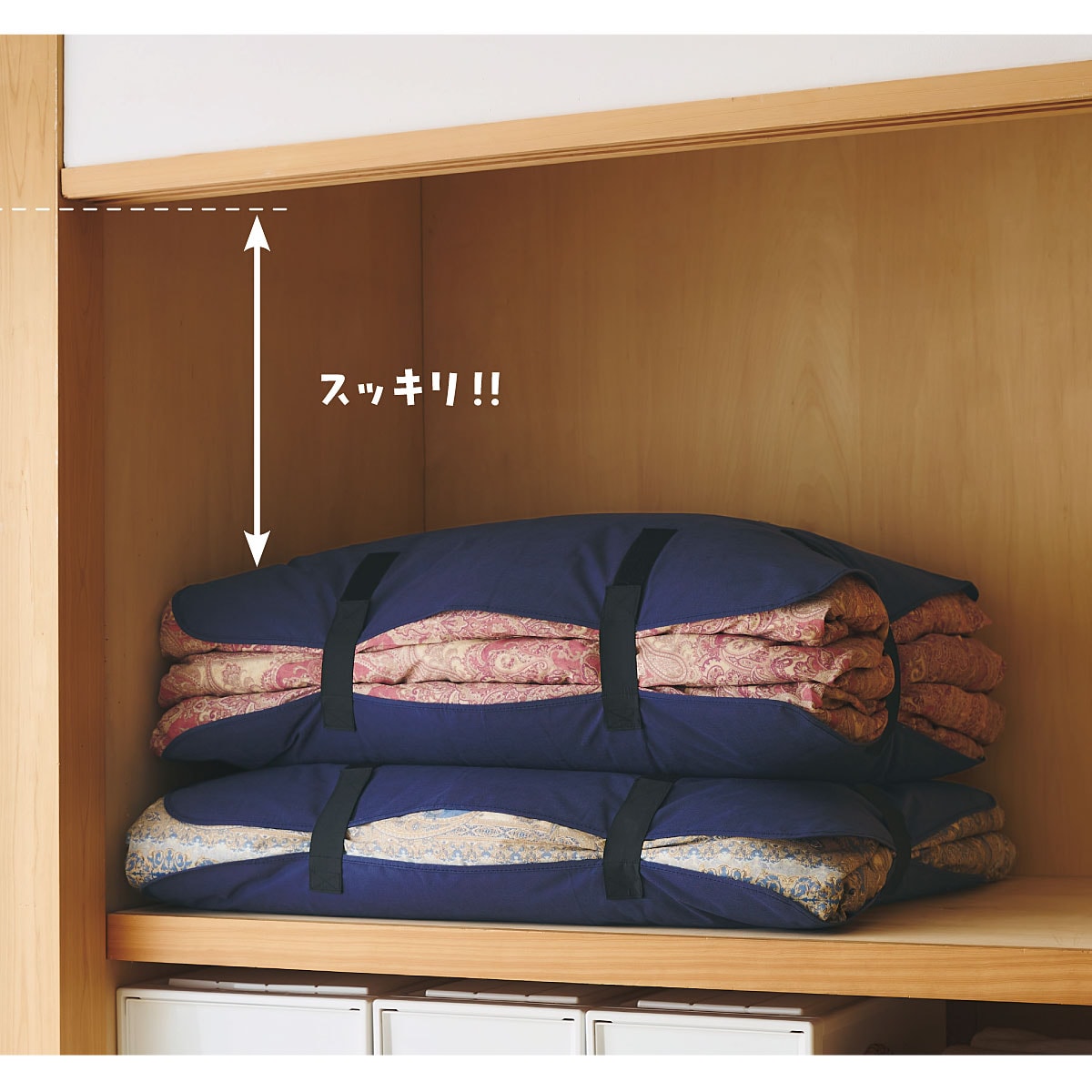 かさばる羽毛布団を挟みワンタッチテープで留めるだけで、圧縮することなくコンパクトに収納。不織布なので通気性もあります。