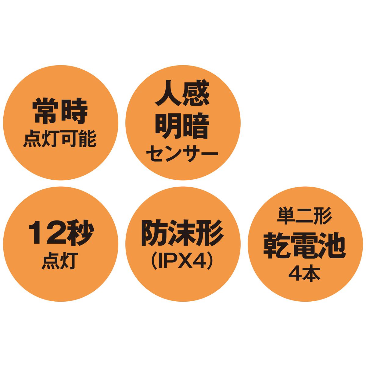 常時点灯可能 人感明暗センサー 12秒点灯 防沫形(IPX4) 単二形乾電池4本