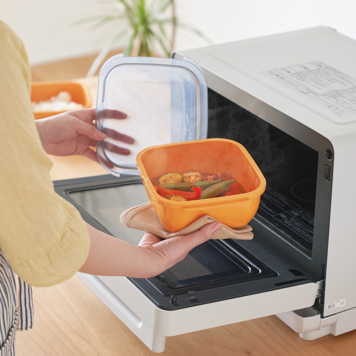 電子レンジとこれ1台で煮る・炒める・茹でる・蒸す・炊く・オーブン調理の6役を担ってくれます。独自の加圧構造で野菜の無水調理も栄養を逃さず、火が通りやすいため時短調理にも。耐熱温度約230℃なのでオーブンでの調理もOKです。独自の加圧構造により短時間で調理可能で、ボウル・調理器具・保存容器として1台で完結し、洗い物削減にも。