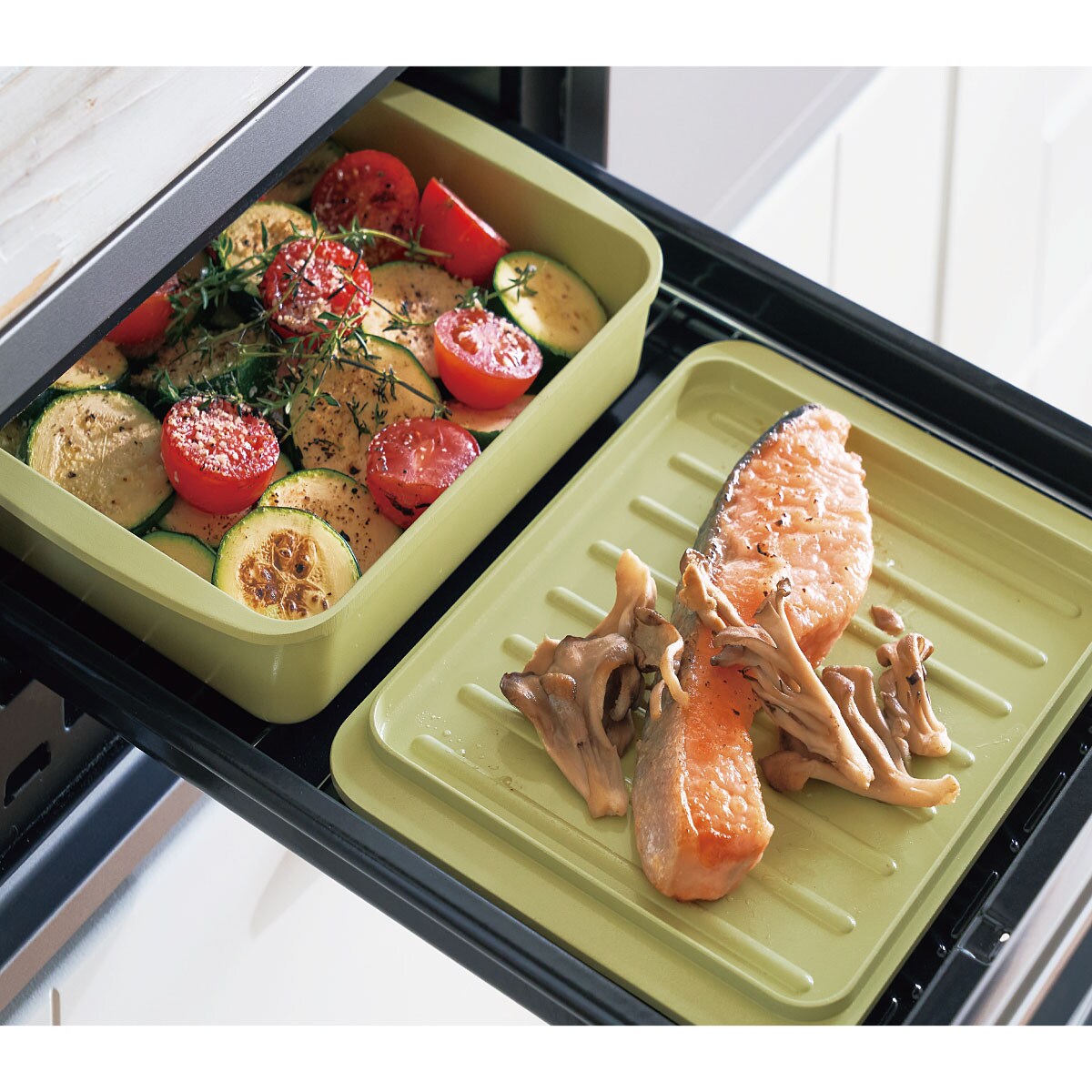 1~2人分にちょうどいいサイズ。調理プレートとしても使えるふたの内面は波型で、凹部分に油を落としてヘルシー。一般的な魚焼きグリルなら、本体とふたを並べられるので同時に2品の調理も進められます。