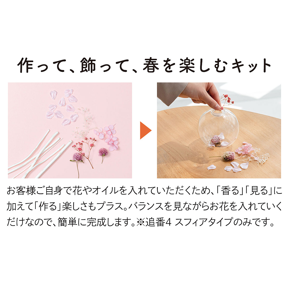 春に咲く花々の美しさをそのままドライフラワーやアーティフィシャルフラワーにして透明感あふれるガラスボトルに閉じ込めました。優しい桜の香りがふわりと広がり、心はずむ春の訪れを感じさせてくれます。お客様ご自身で花やオイルを入れていただくため、「香る」「見る」に加えて「作る」楽しさもプラス。バランスを見ながらお花を入れていくだけなので、簡単に完成します。