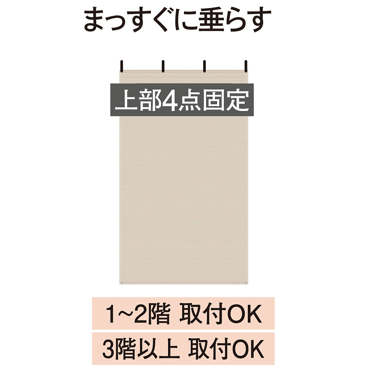壁や手すりから垂らす※90×200cmのみ上部固定は2点となります。