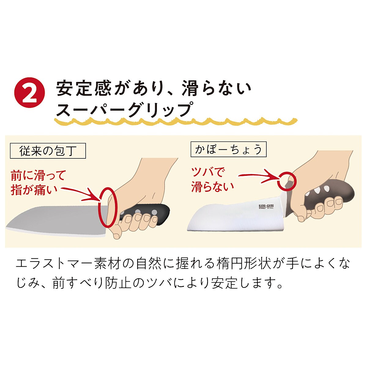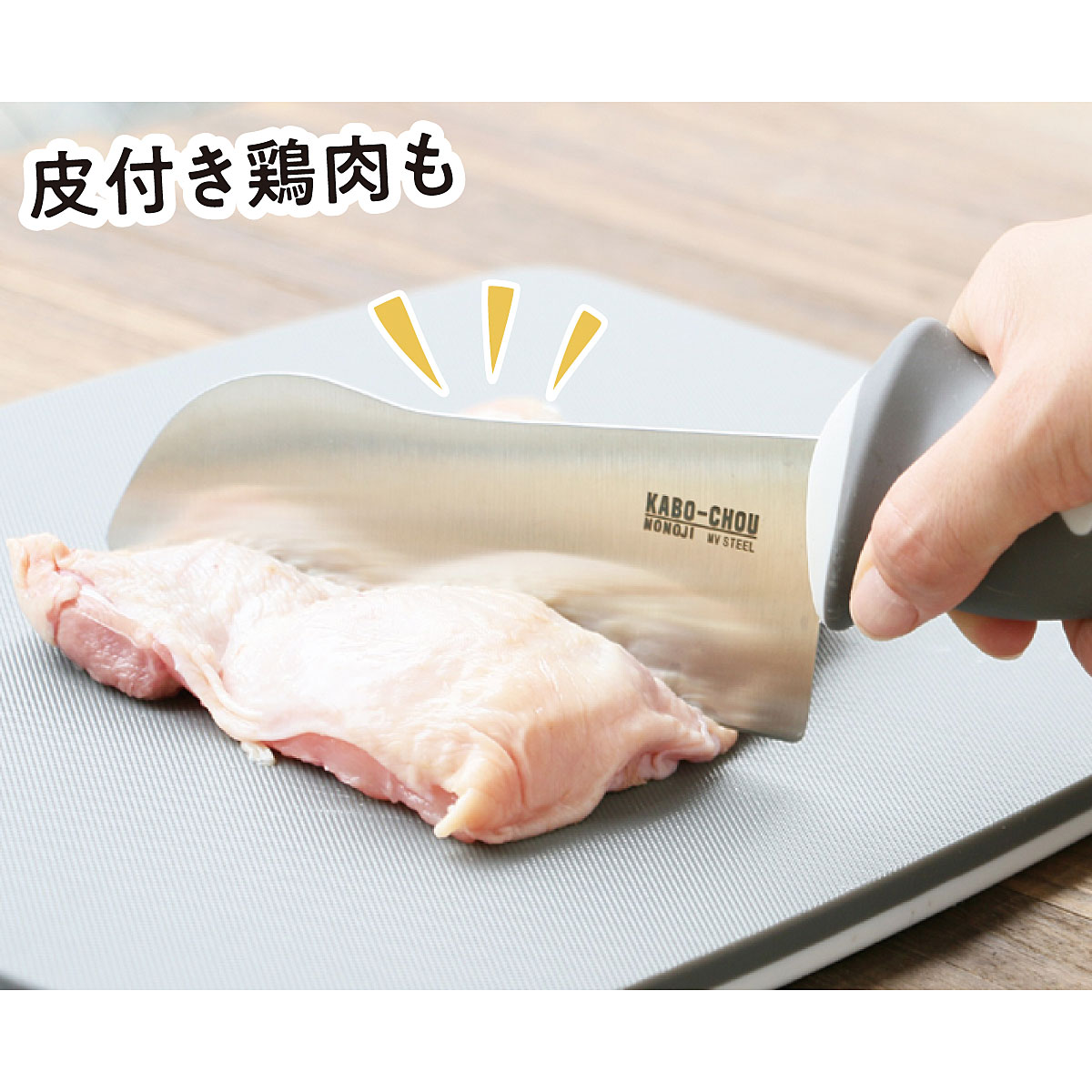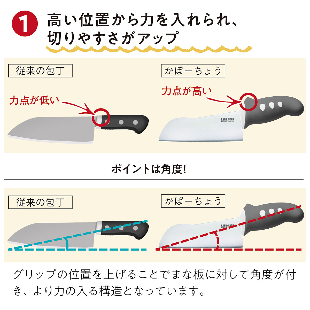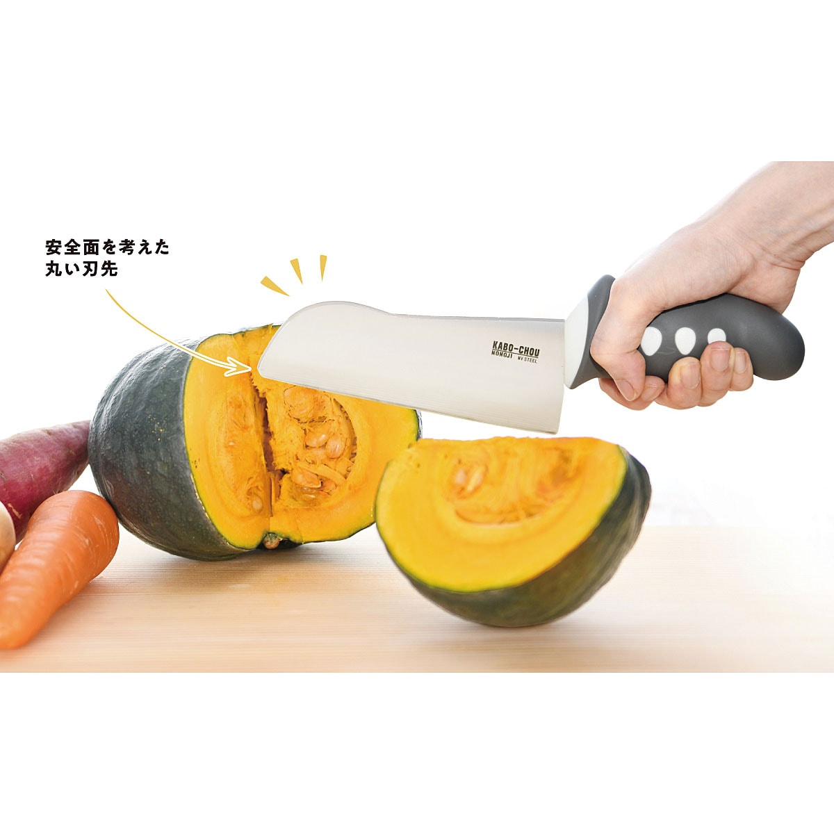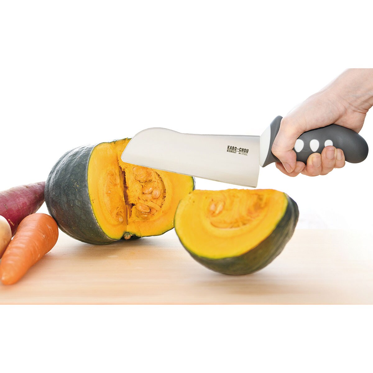 【ここがすごい!技ありポイント】(1)全ての指でしっかり握れ、刃先に力が効率的に伝わる極太グリップを採用。(2)グリップの位置を高くしているので力がダイレクトに伝わりやすい!(3)使用する刃は、医療用メスにも採用される強固なモリブデンバナジューム鋼製。刃先は丸型で、前滑りしずらいツバがついているので安心です。かぼちゃ以外にも、パイナップル、さつまいも、餅、肉類、魚類など硬い食材だけでなく、一般的な菜切り包丁と同じ用途でお使いいただけます。切りにくい皮付き鶏肉もきれいにカットします。