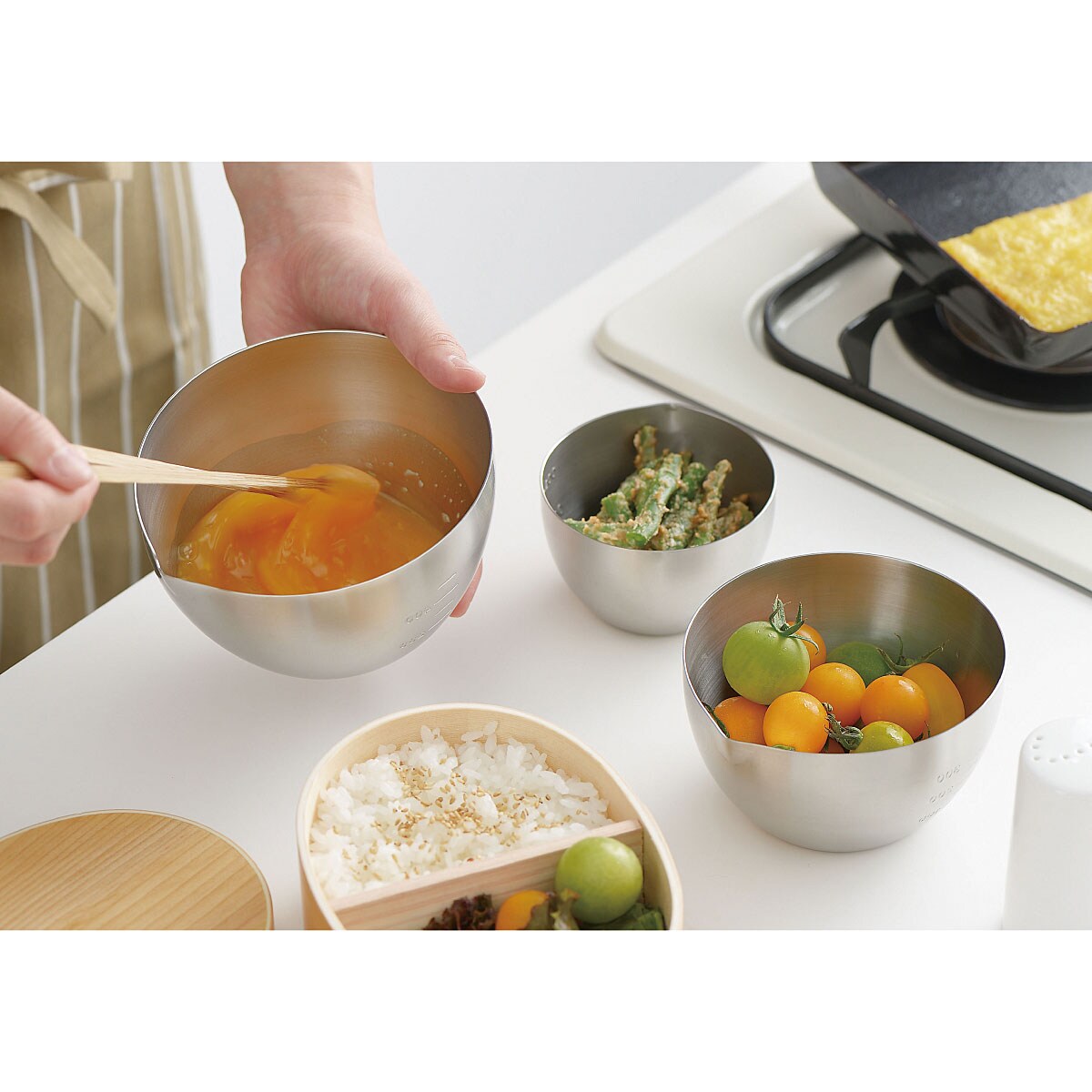 料理の下ごしらえに使える片手サイズのボウル。