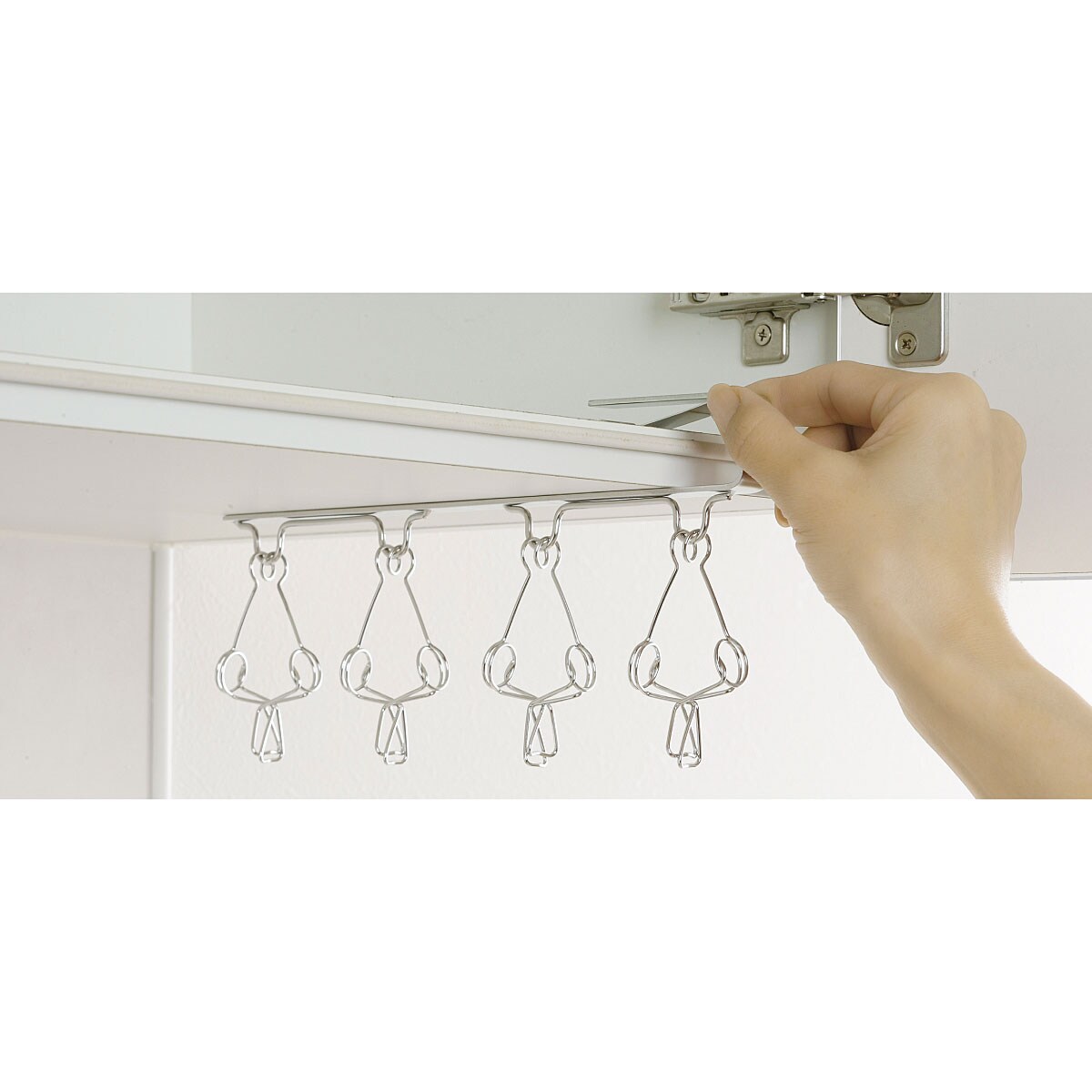 てこの原理でしっかり開く吊戸棚ピンチ。少ない力で大きく開くので、指が痛くなりません。吊戸棚にサッと差し込むだけで設置できます。台所用手袋やふきん、食品保存袋などが干せて便利。