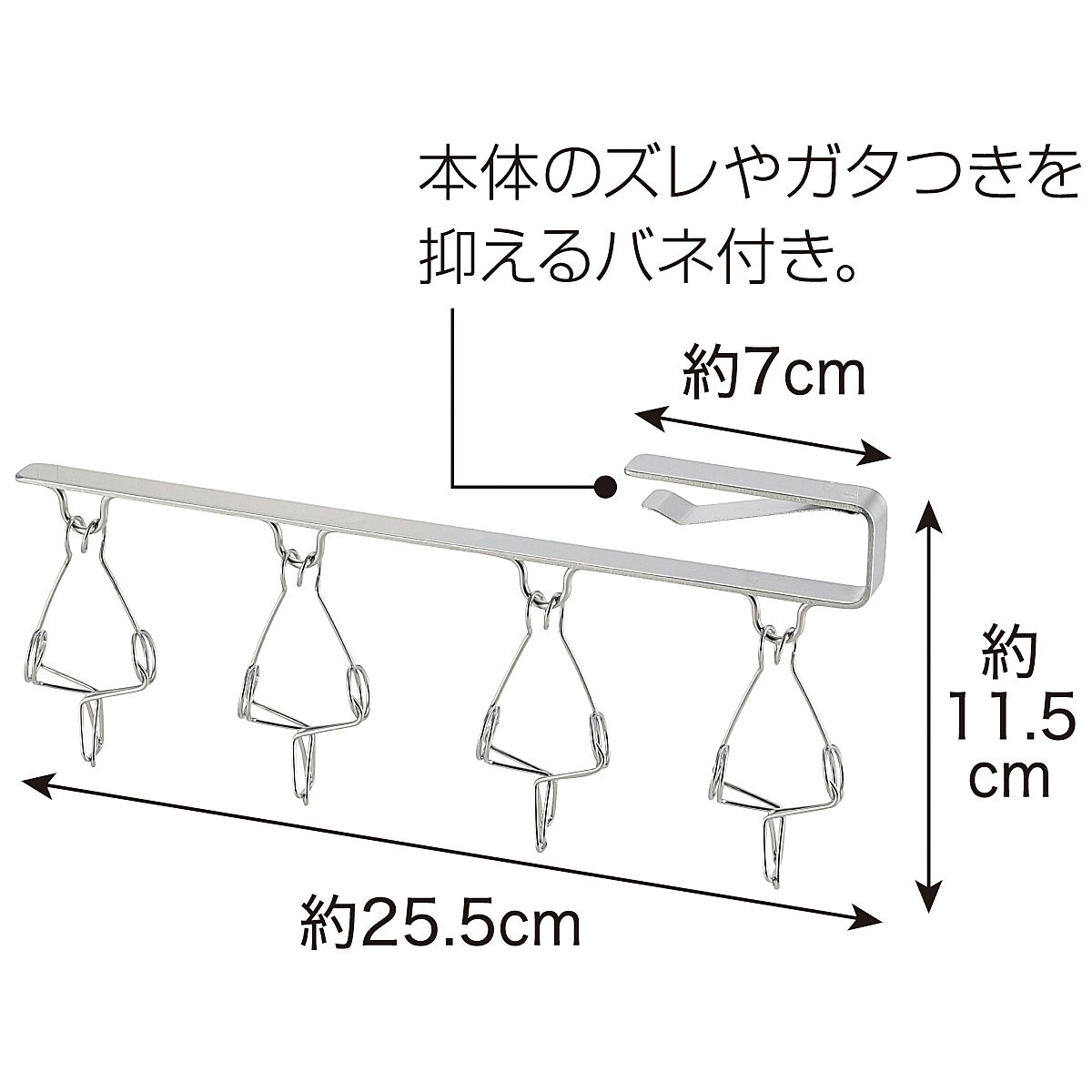 ■素材/ステンレス ■サイズ(約cm)/25.5×1.6×高さ11.5 ■重量/約105g ●耐荷重/約500g ※引っ掛け上部の奥行きは約7cmです。扉と棚板のすき間は3mm以上、棚板の厚さ1~2cmまで設置可能。●日本製