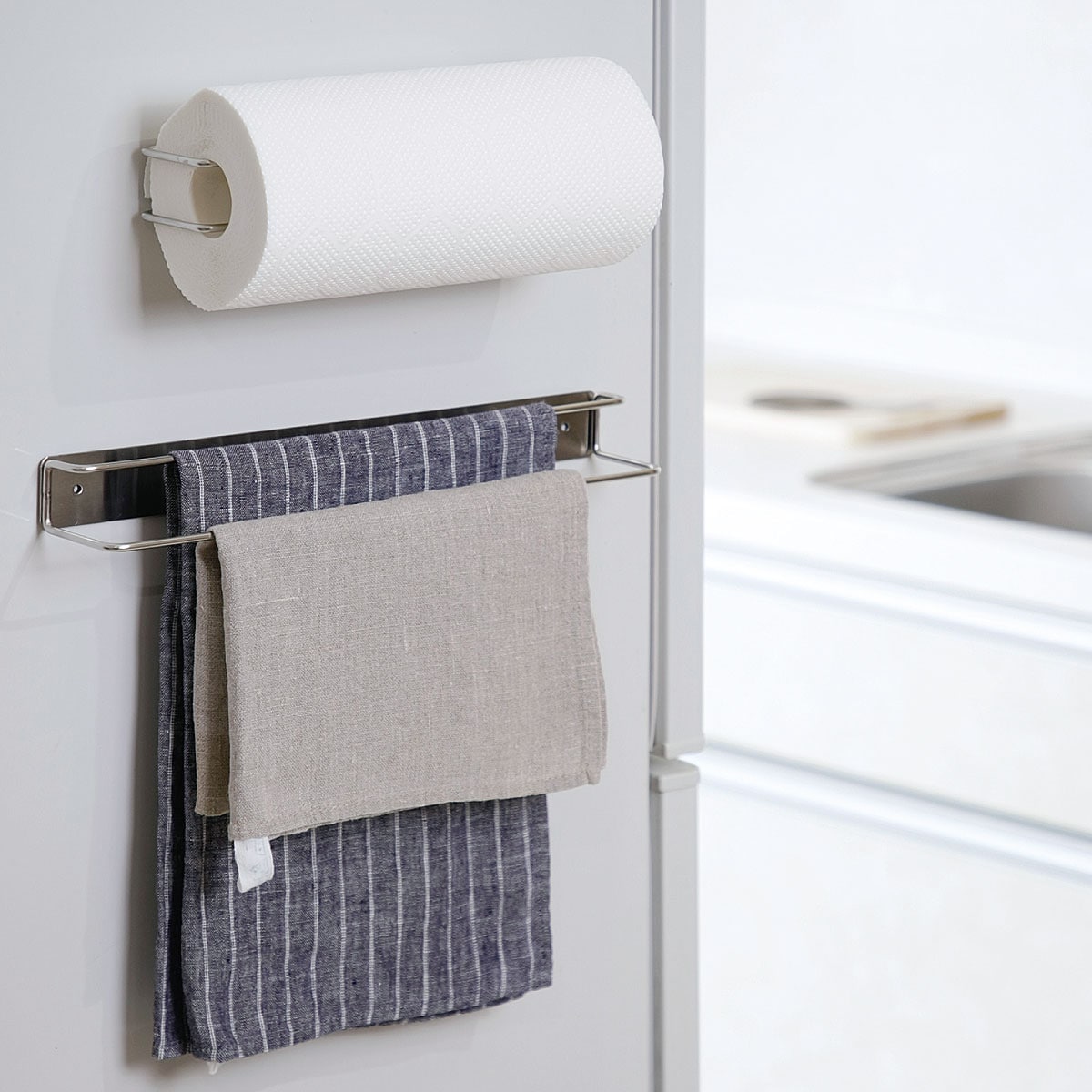 マグネットまたはネジ止め、の2通りの方法で固定できる壁付けふきん掛け。冷蔵庫から壁面までお好みの場所に取り付けできます。上段・下段でふきんをかける位置が前後にずれているので、重ならずに清潔に乾かせます。