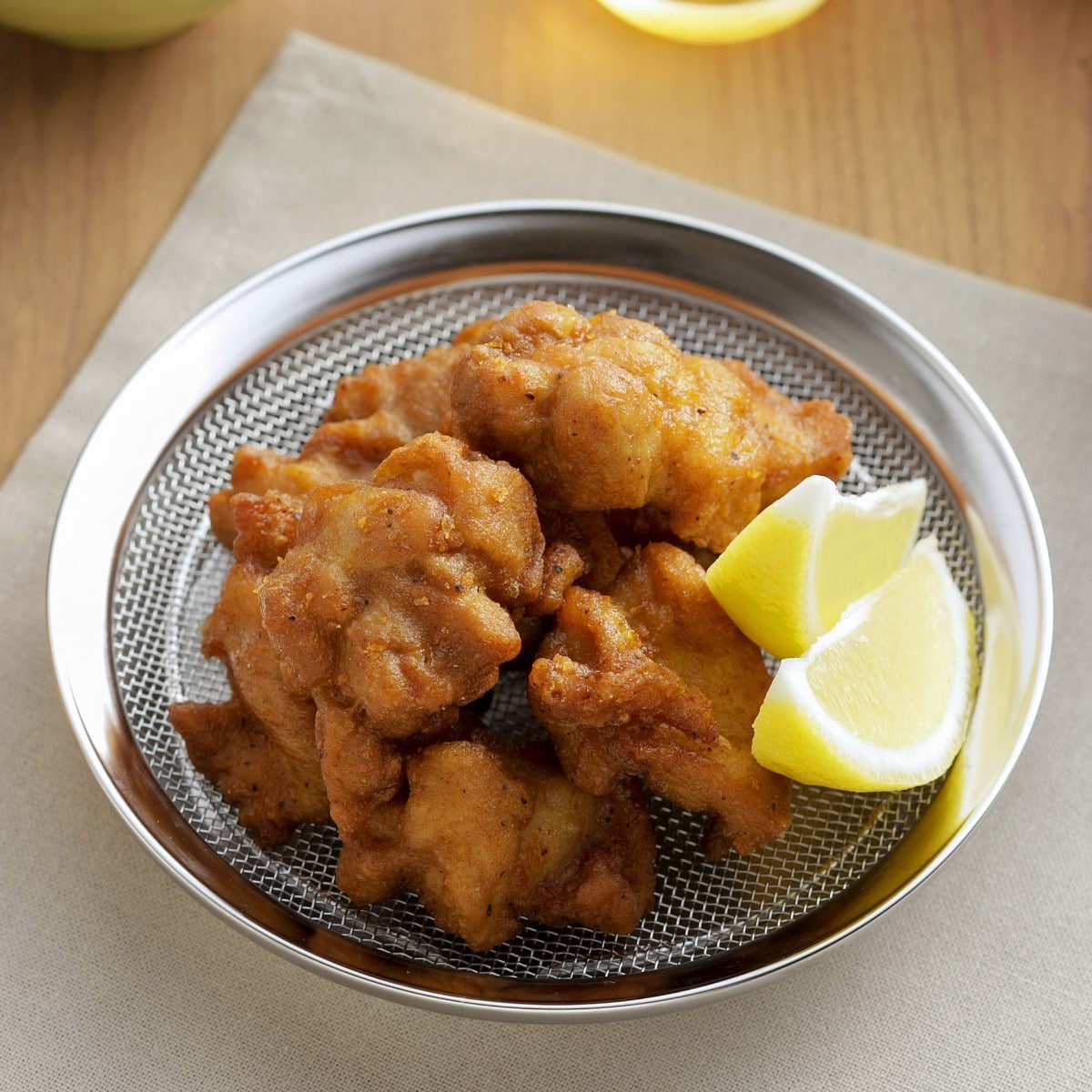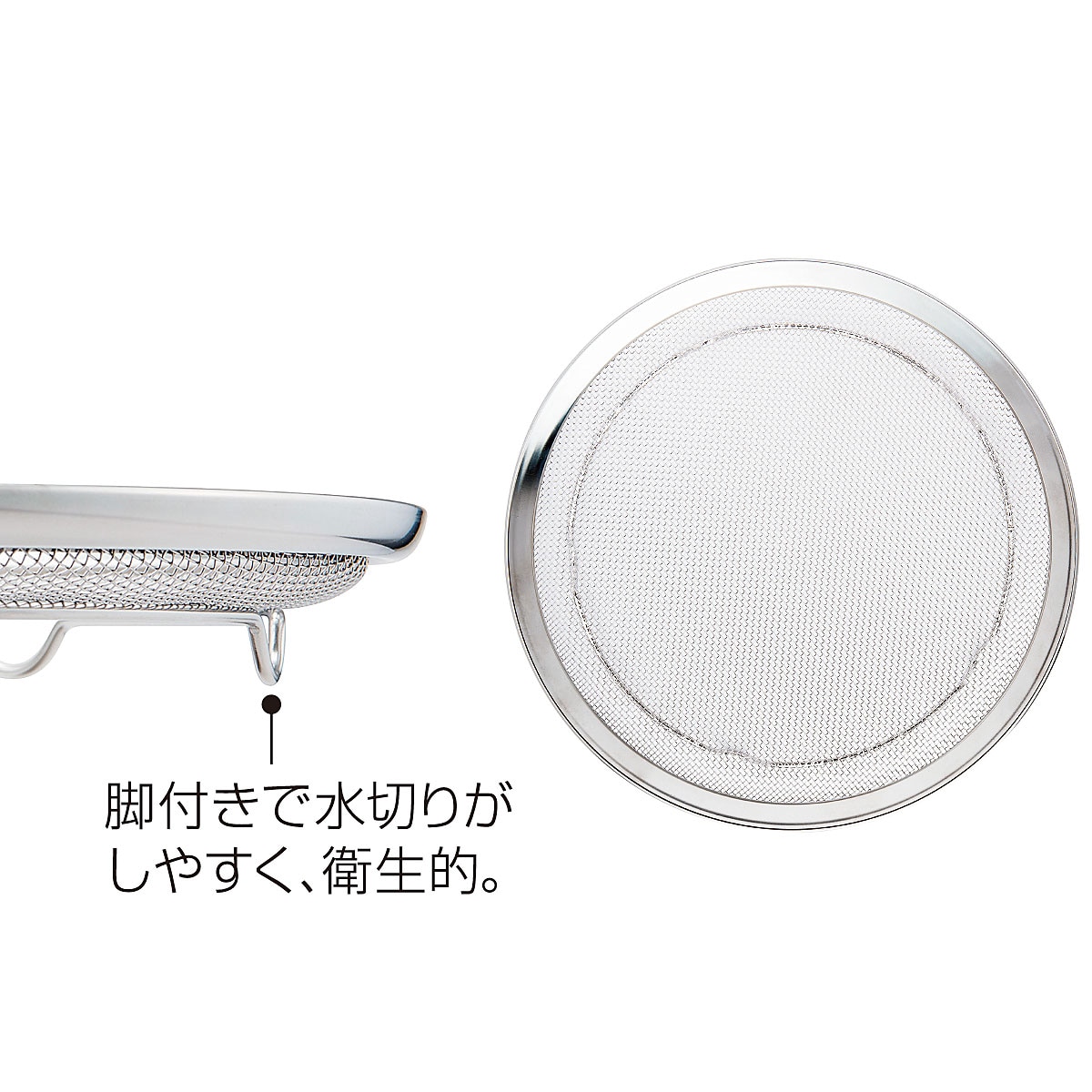 食材を広げて効率良く水切りを。高さのある脚付きなので作業台にそのまま置いても安心。家事問屋丸形トレー 品番:WF-6576 とセットでご利用いただけます。