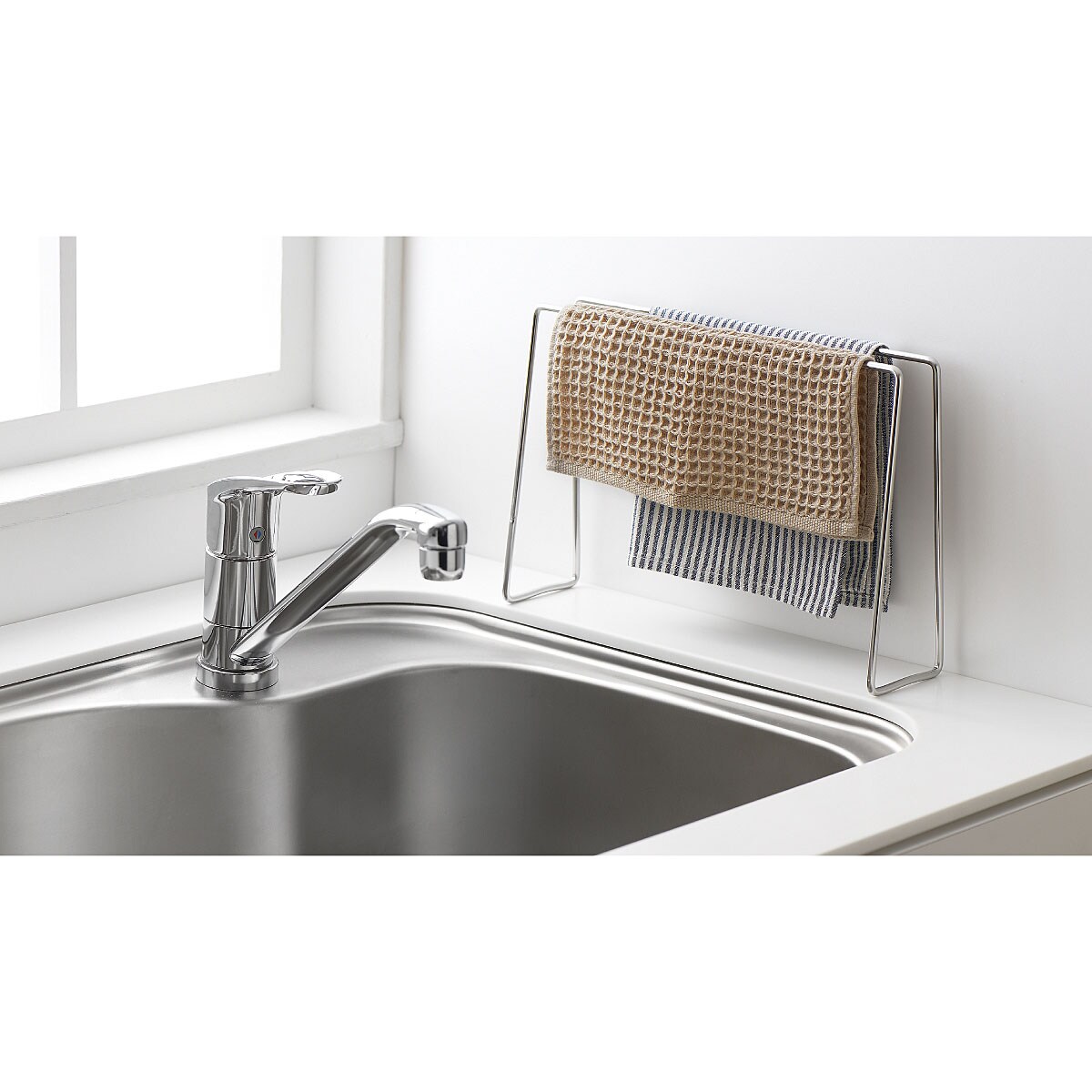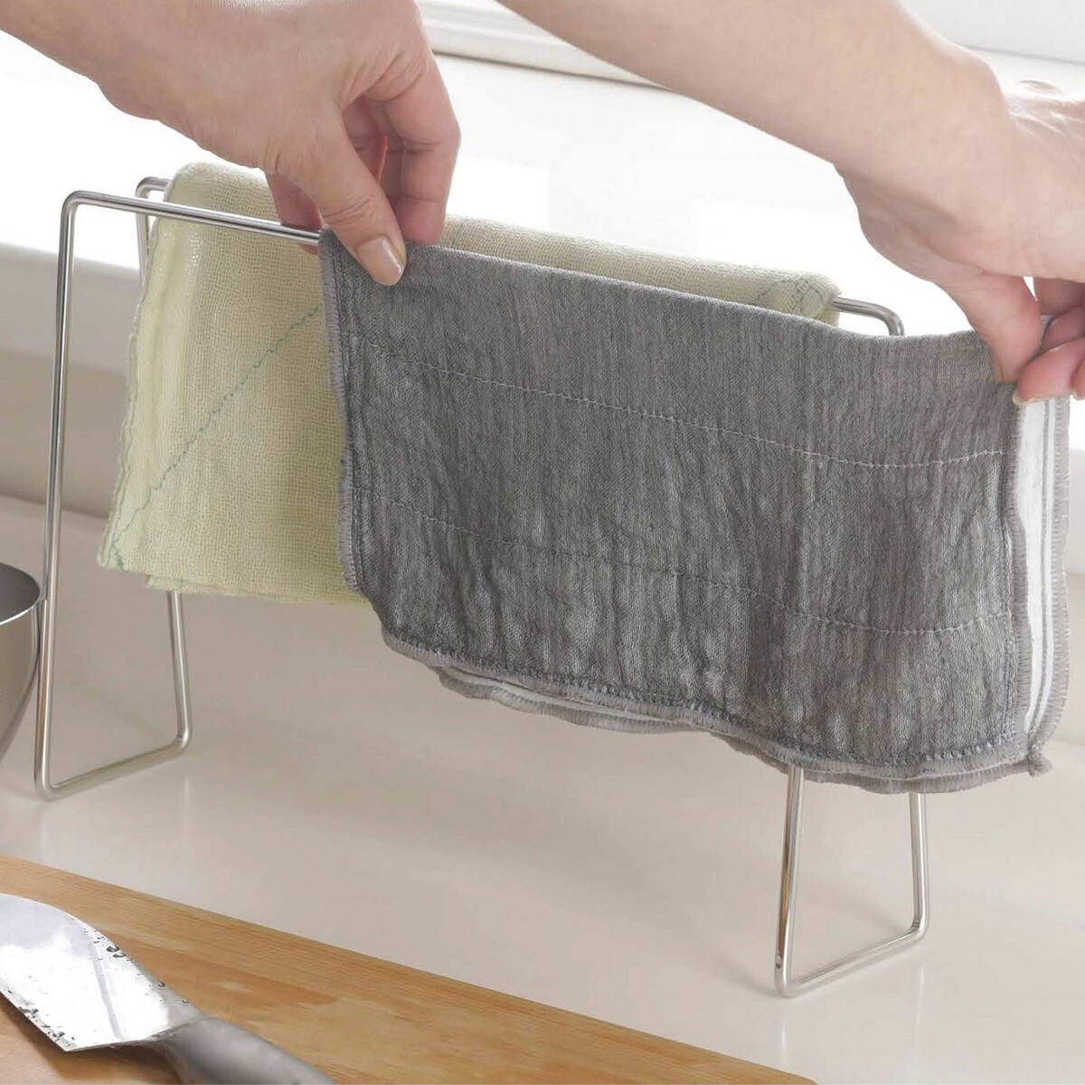 ふきんを横からサッと掛けられます。2枚のふきんが重ならず、風を通しながら清潔に乾かすことができます。シンクの壁際にさりげなく置いておけ、使わない時も邪魔になりません。素材はサビにくいステンレス製でいつも清潔にお使いいただけます。