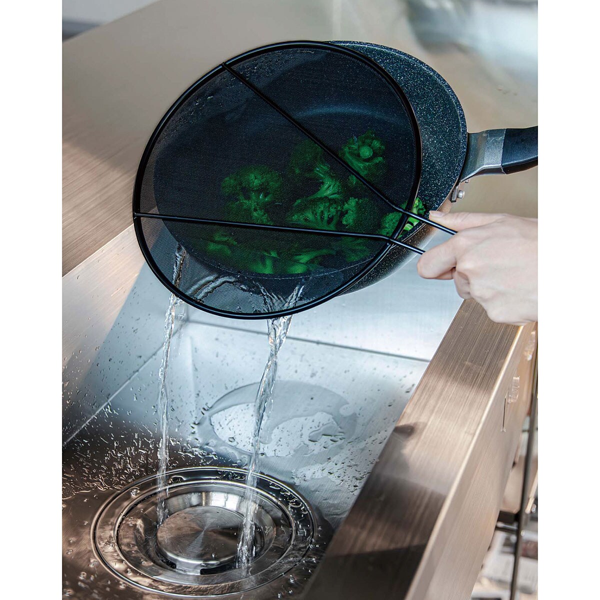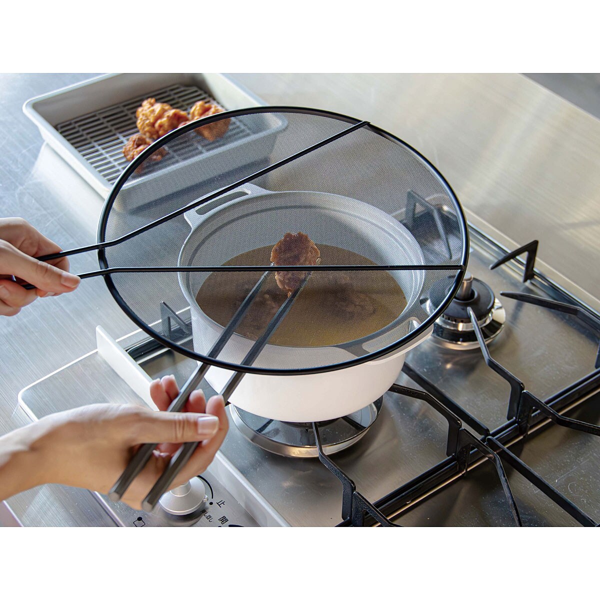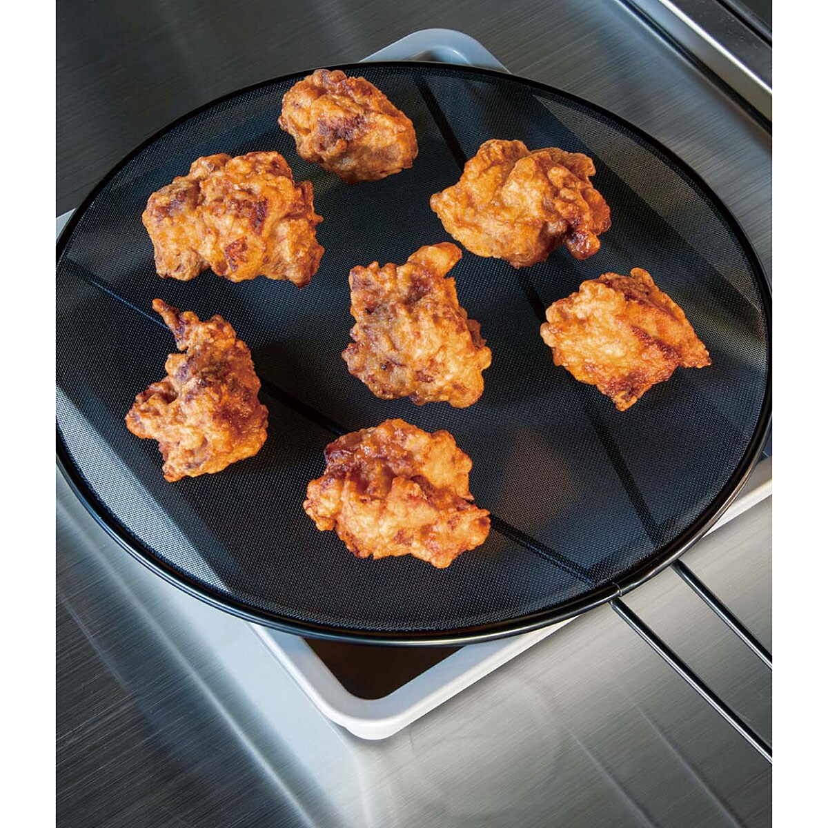 揚げ物の飛び散りを防いでくれる油はねガード。ふっ素加工を施した黒メッシュで反射しにくく、調理中も食材の様子を確認することができます。