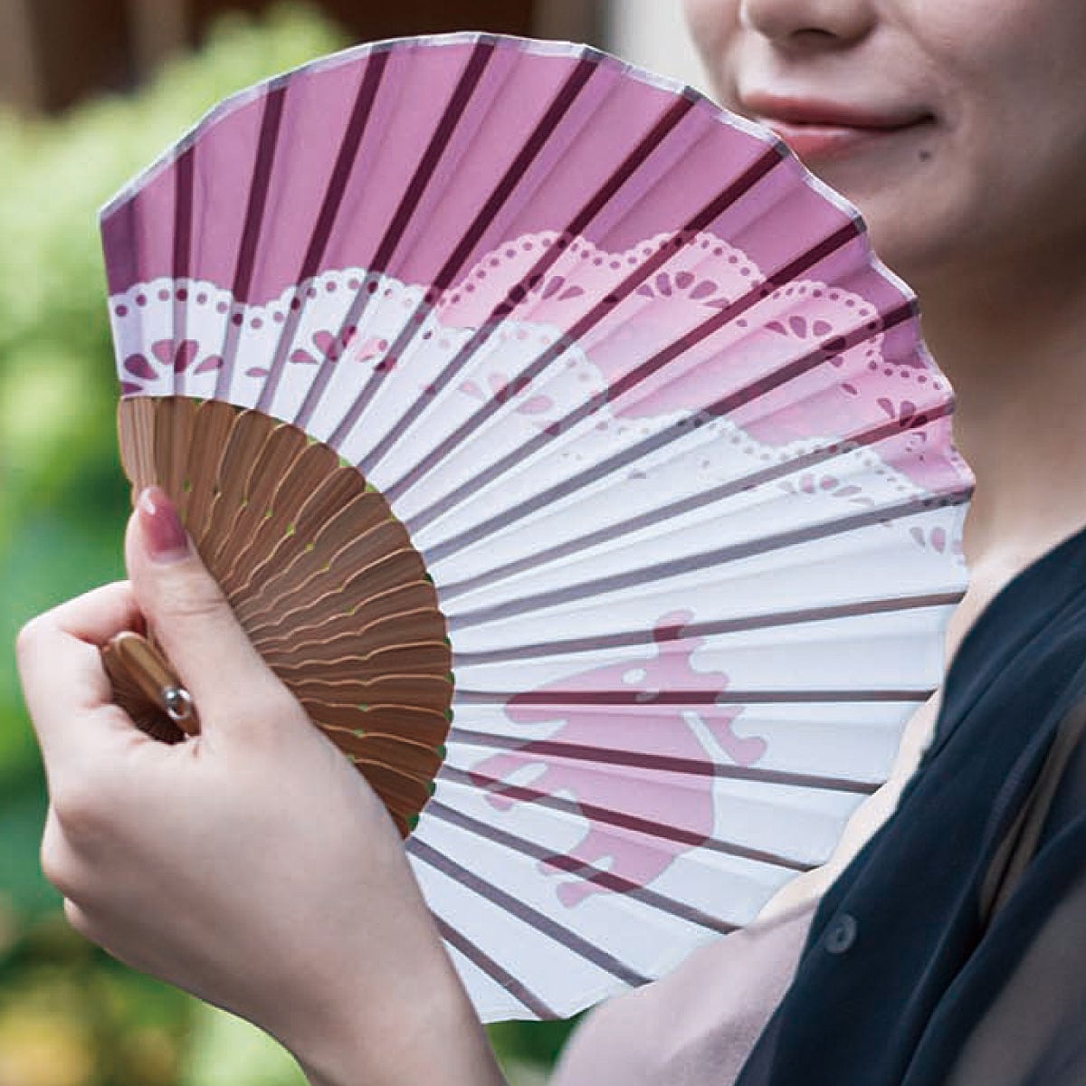 ■[扇子(生地)]ポリエステル100% [骨組み]竹 [ストラップ]PVC [カバー]ポリエステル ■サイズ(約cm)/21×23(開いた時の最長)●中国製