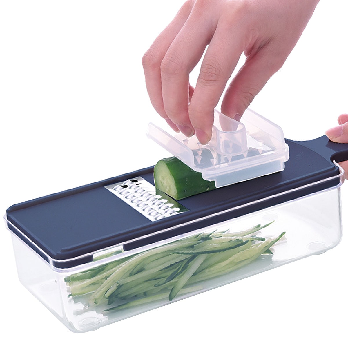 包丁だと切りにくい野菜の千切りや、キャベツの千切りなどをパパッとお料理♪まな板も使わないので、洗い物も減って時短になります。〇お料理がはかどる7点セット(1)千切りプレート(2)平切りプレート(3)おろしプレート(4)ピーラー(5)滑りやすい食材や小さい野菜も安心してスライスできる食材ホルダー(6)ケース(7)カバー 全部まとめてコンパクトに収納できます。〇全プレートの先端はフックの形状プレート先端はフック形状で、ボウルやザルとも組み合わせても使えます。