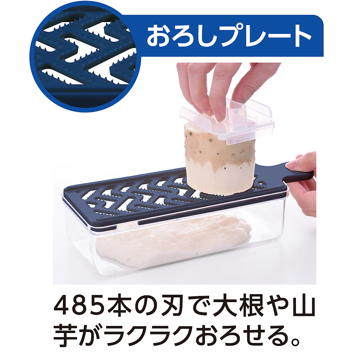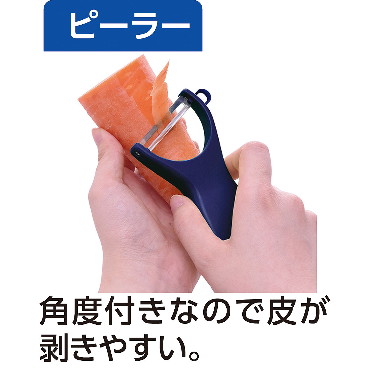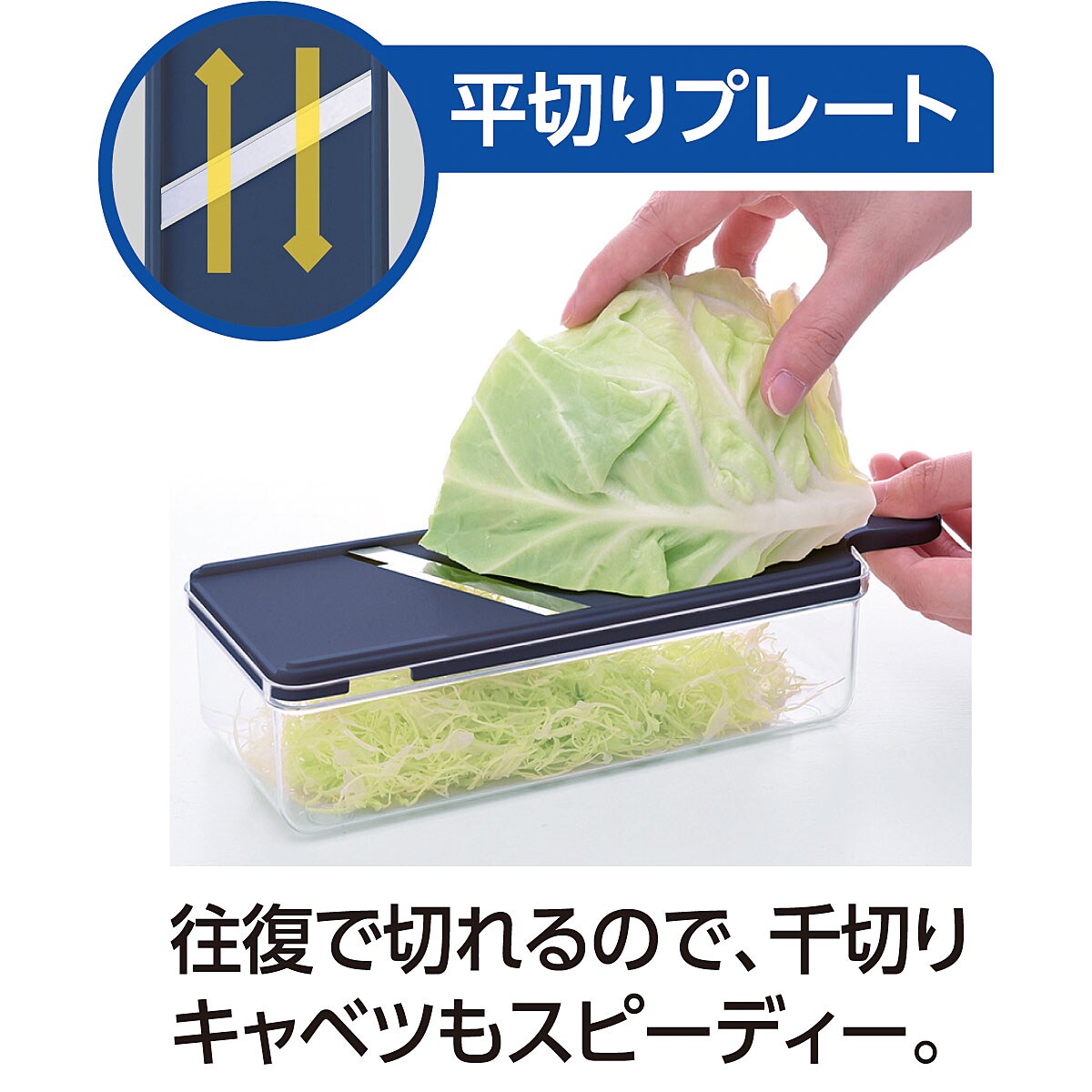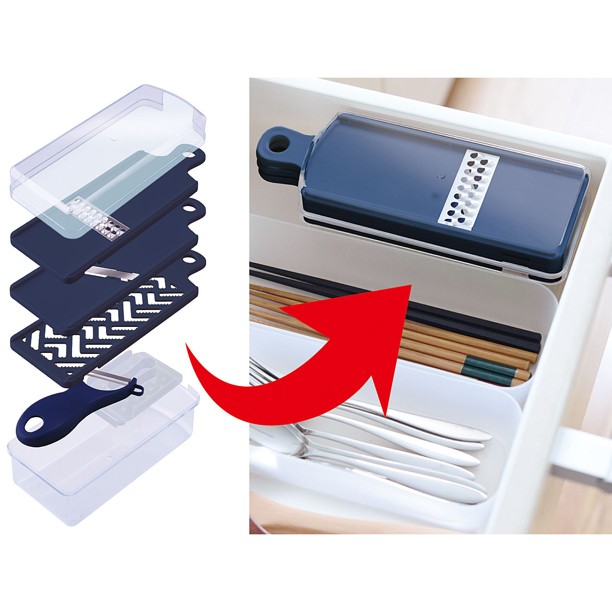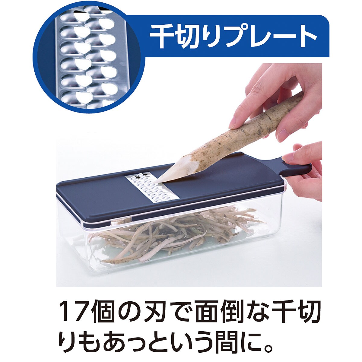 ■[ケース・カバー]スチロール樹脂、シリコーンゴム(すべり止め) [プレート]ABS樹脂、ステンレス鋼(刃) [安全ホルダー]ポリプロピレン [ピーラー]ABS樹脂、ステンレス鋼(刃) ■サイズ(約cm)/[スライサーセット]23×8.5×高さ7.5(収納時) [ピーラー]13×7×1.5 ■重量/約310g(収納時)■耐熱温度:ケース、カバー、プレート、ピーラー80℃ 安全ホルダー110℃ ※食器洗い機・食器洗い乾燥機使用不可●日本製