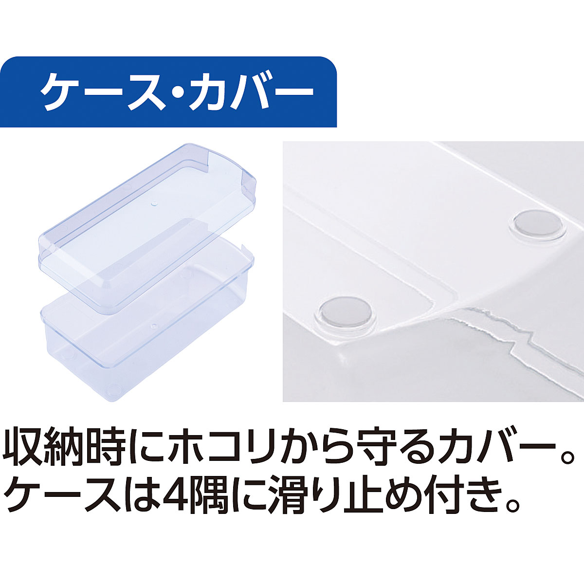 収納時にホコリから守るカバー。ケースは4隅に滑り止め付き。