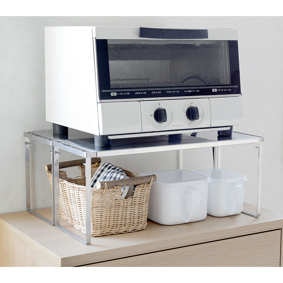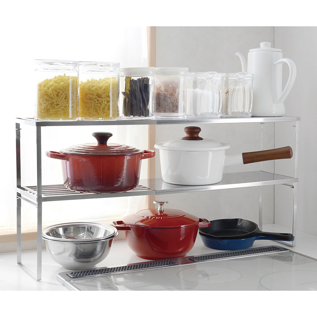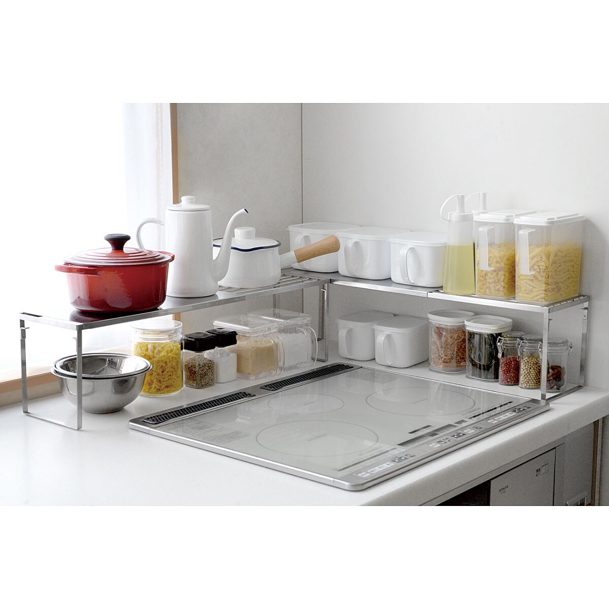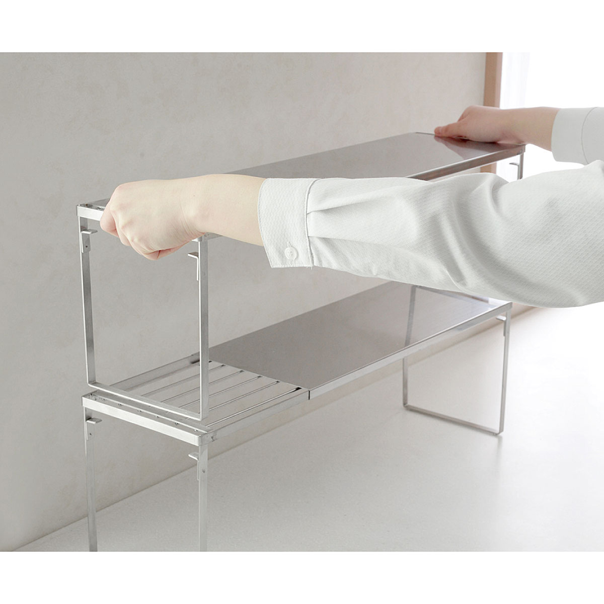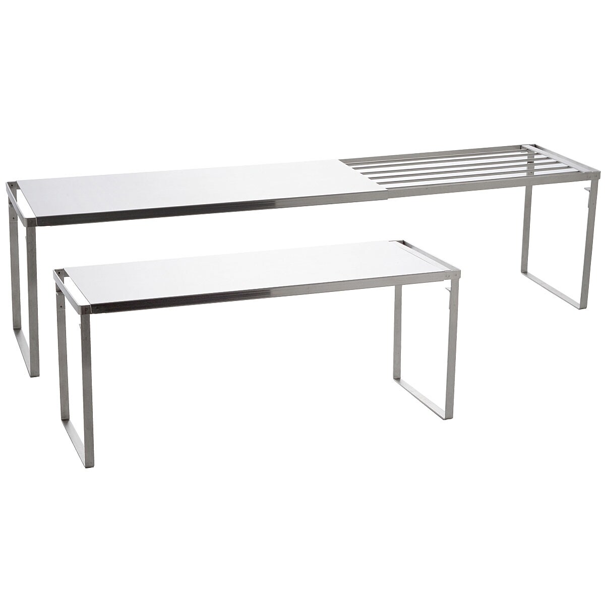 ■[本体]ステンレス鋼 [脚ゴム]シリコーンゴム ■サイズ(約cm)/42.5~69.5×16.5×高さ18.5 ※2個組を2段で使用した場合:幅42.5~69.5×奥行16.5×高さ34.5 ■重量/約1kg (1個)■耐荷重/約10Kg(2段で使用する場合は各段10Kg)●日本製
