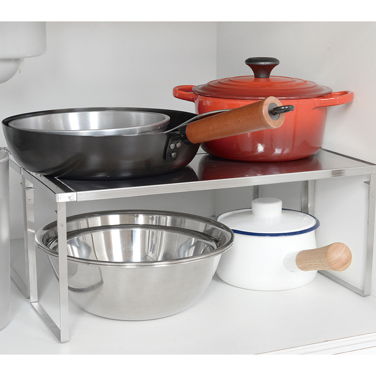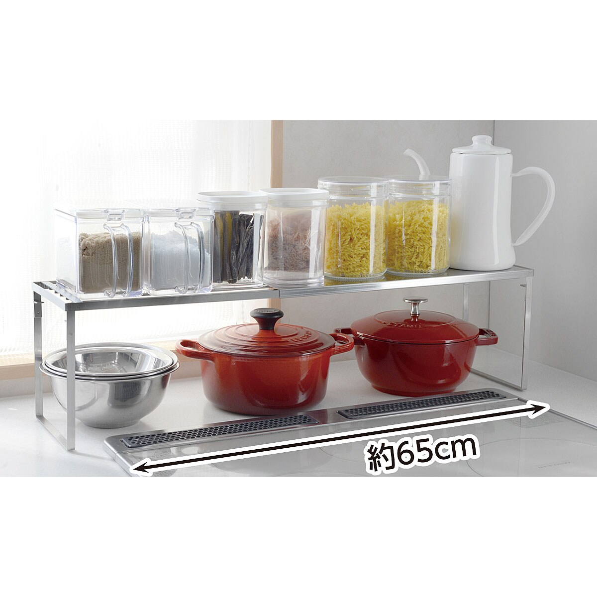 スライドして伸縮できるキッチンラックです。約42.5~69.5cmまでの伸縮式。お鍋やフライパン、調味料などのキッチンツールが収納できます。〇シンク周りや下、コンロ奥、食器棚、洗面台などアイデア次第で色々な場所でお使いいただけます!〇2個組では、2段重ね・L字型に配置してもお使いいただけます。〇ステンレス製なので汚れてもサッとふき取るだけ。