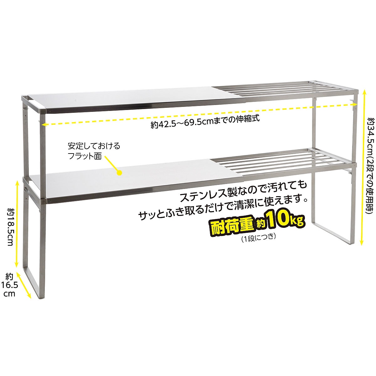 ■[本体]ステンレス鋼 [脚ゴム]シリコーンゴム ■サイズ(約cm)/42.5~69.5×16.5×高さ18.5 ※2個組を2段で使用した場合:幅42.5~69.5×奥行16.5×高さ34.5 ■重量/約1kg (1個)■耐荷重/約10Kg(2段で使用する場合は各段10Kg)●日本製