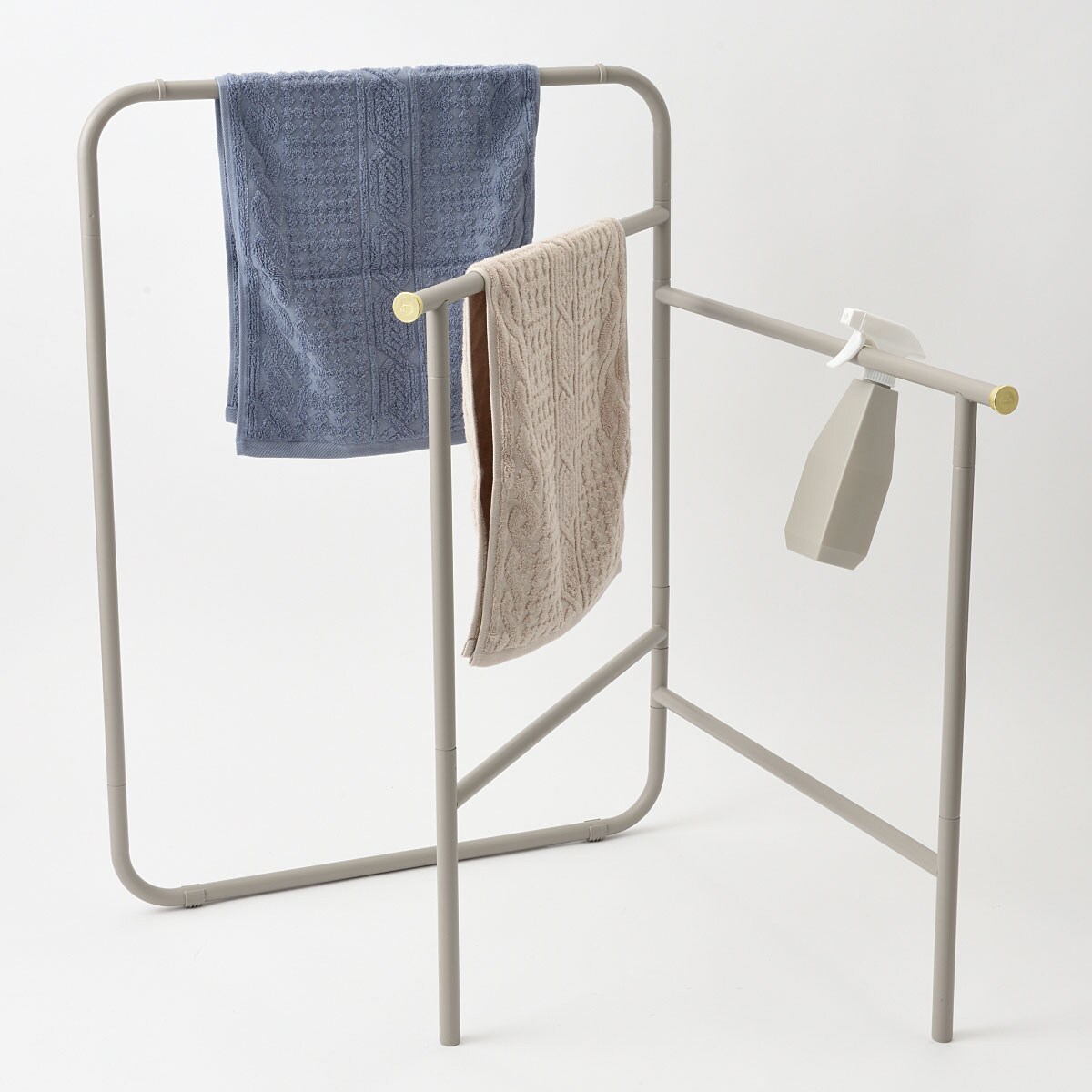 〈タオルをまとめて部屋干しできるスタンド〉浴室に置いて濡れたバスタオルやバスマットのちょい掛けをしたり、次の洗濯まで干しておきたい一時置きにも重宝します。〈高さ違いのバーで大小さまざまなタオルを干せるタオルスタンド〉タオルを横からサッと掛けられるシンプルデザイン♪使わない時は、コンパクトに折りたたんで収納できます!差し込むだけで組み立てできる♪簡単!