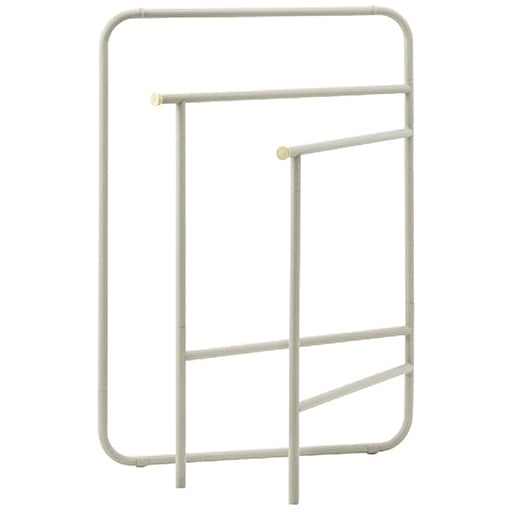 ■[本体]スチールパイプ(粉体塗装) [樹脂部品]ポリプロピレン、EVA樹脂 [金属部品]スチール(メッキ加工) ■サイズ(約cm)/[使用時]64×6~64×高さ87 [収納時]64×6×高さ87 ■重量/約1.4kg ■耐荷重(約kg)/[全体]6 [タオルバー]2(1本あたり)●中国製