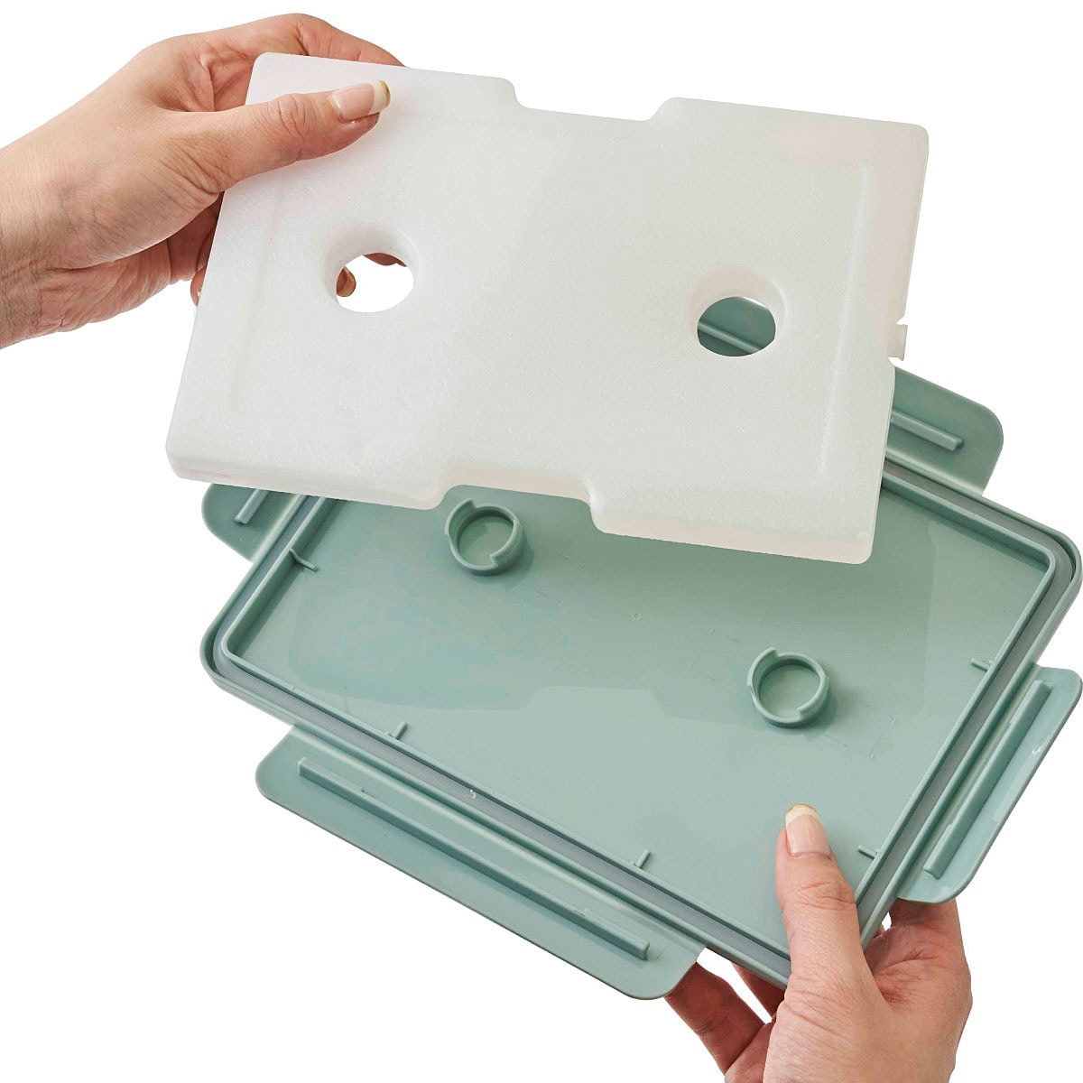 保冷剤だけ冷凍庫に冷やせばOK!上にカチッとはめてクーラー保存容器の完成!