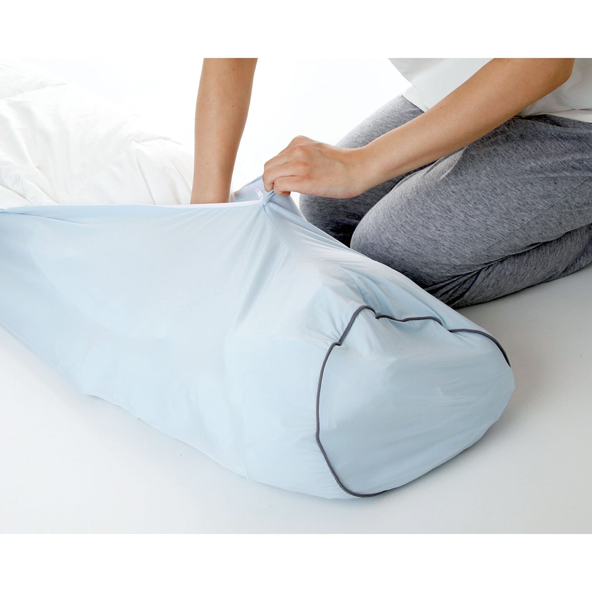 シングル・セミダブル対応 掛け布団を縦長方向に丸めてカバーの端から押し込むように入れると、ふんわりとした抱き枕になります。