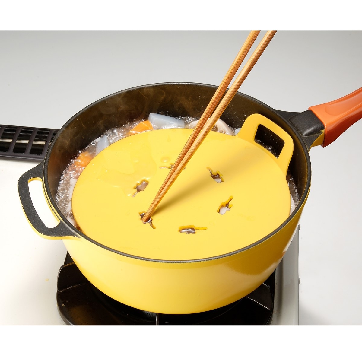 <アク取り>レミパンの形をした穴は、菜箸を引っ掛けて鍋から取るのに便利です