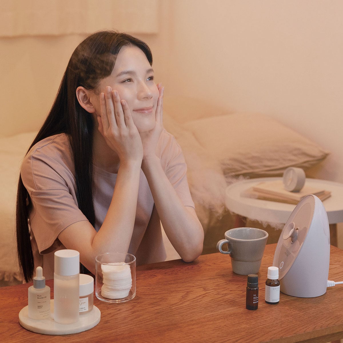 細かな温ナノミストが肌の奥までたっぷり保湿。肌も心も癒す、アロマパッド付属でお好みの香りをたらしてリラックスしながらケアを。