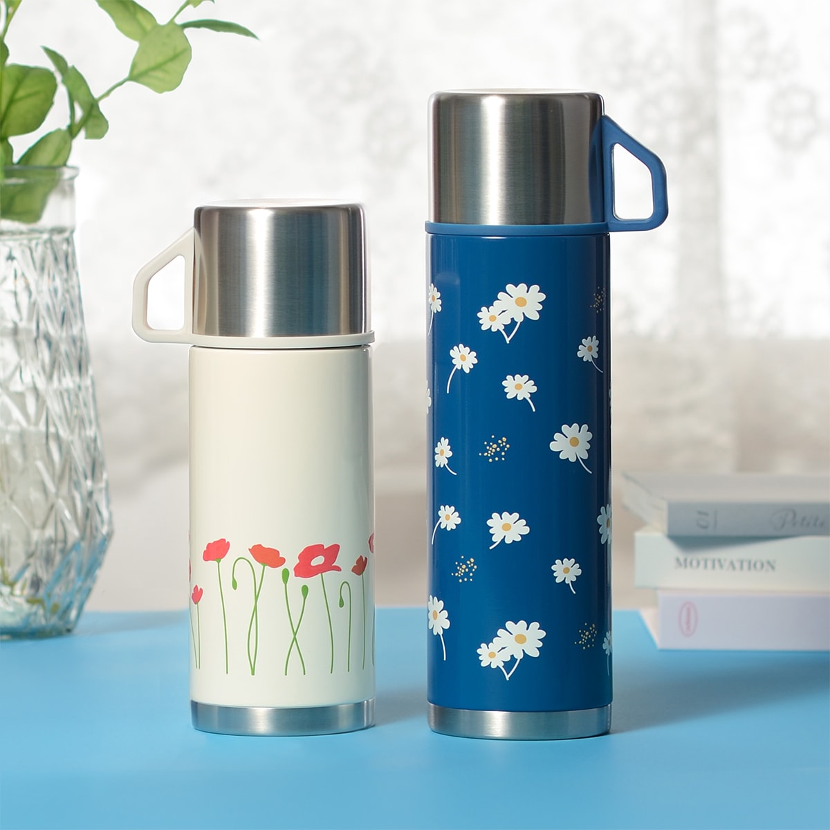 レトロ柄がかわいい、便利なコップ付き保冷保温ボトル♪