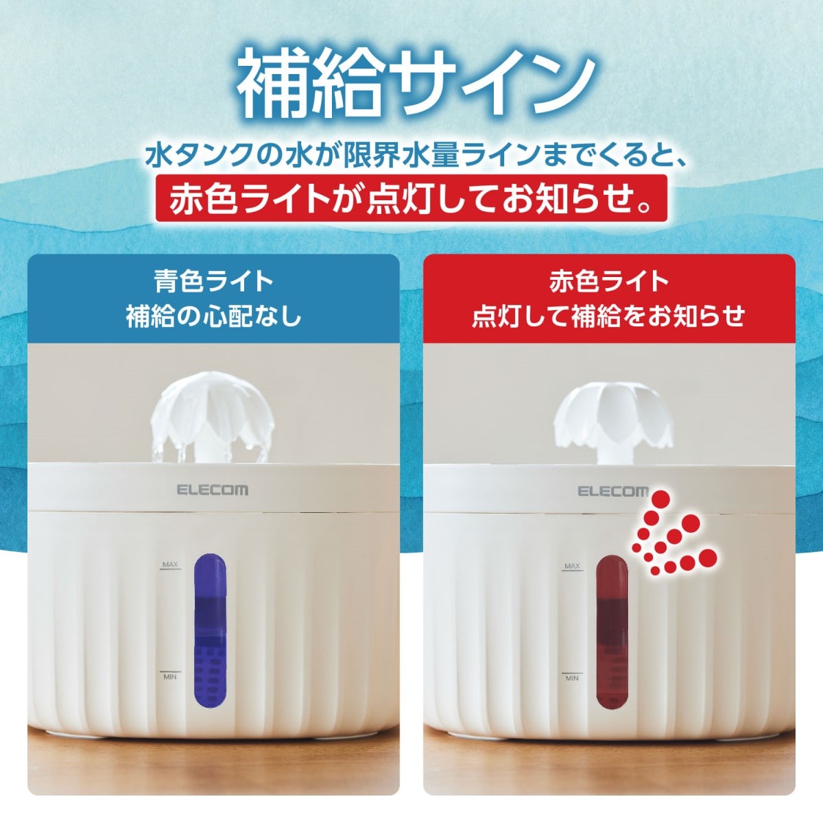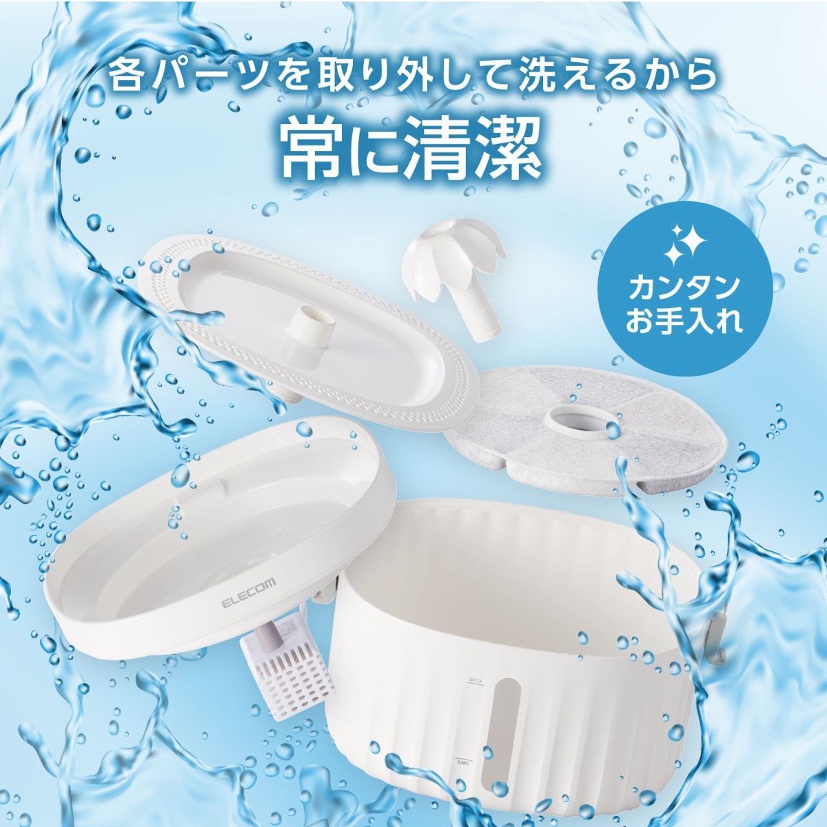 <かわいい家族のためにおすすめのアイテムをご紹介>動作音驚異の超静音設計!〇3層構造高性能フィルター採用:約70%軟水化・塩素除去〇いたずら防止機能〇水タンクも丸洗いOKで簡単お手入れ!〇選べる4つの水流で、飲み方に合わせて高さ調節可能〇水量チェック窓付きで、どれくらい飲んだか確認でき、健康管理に◎