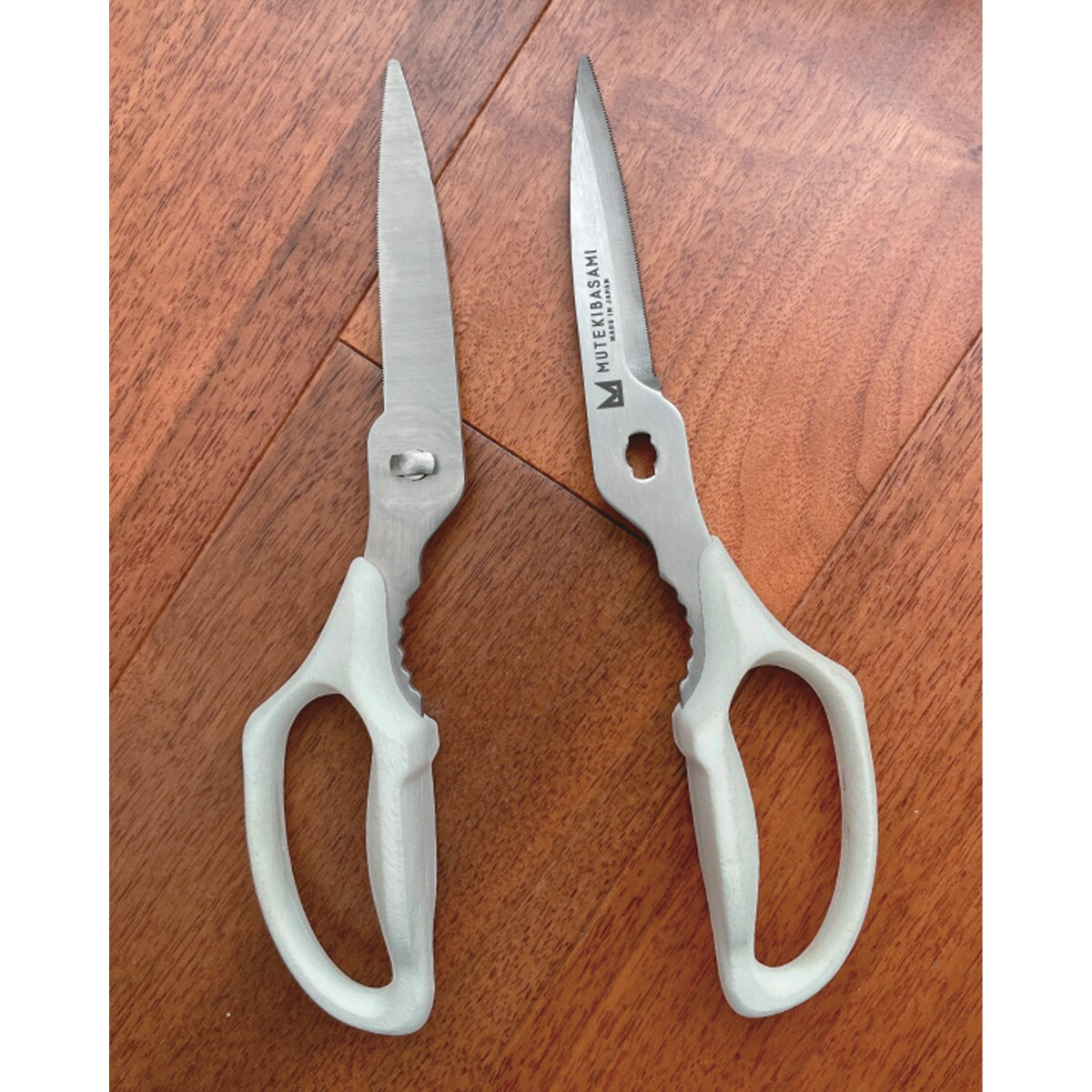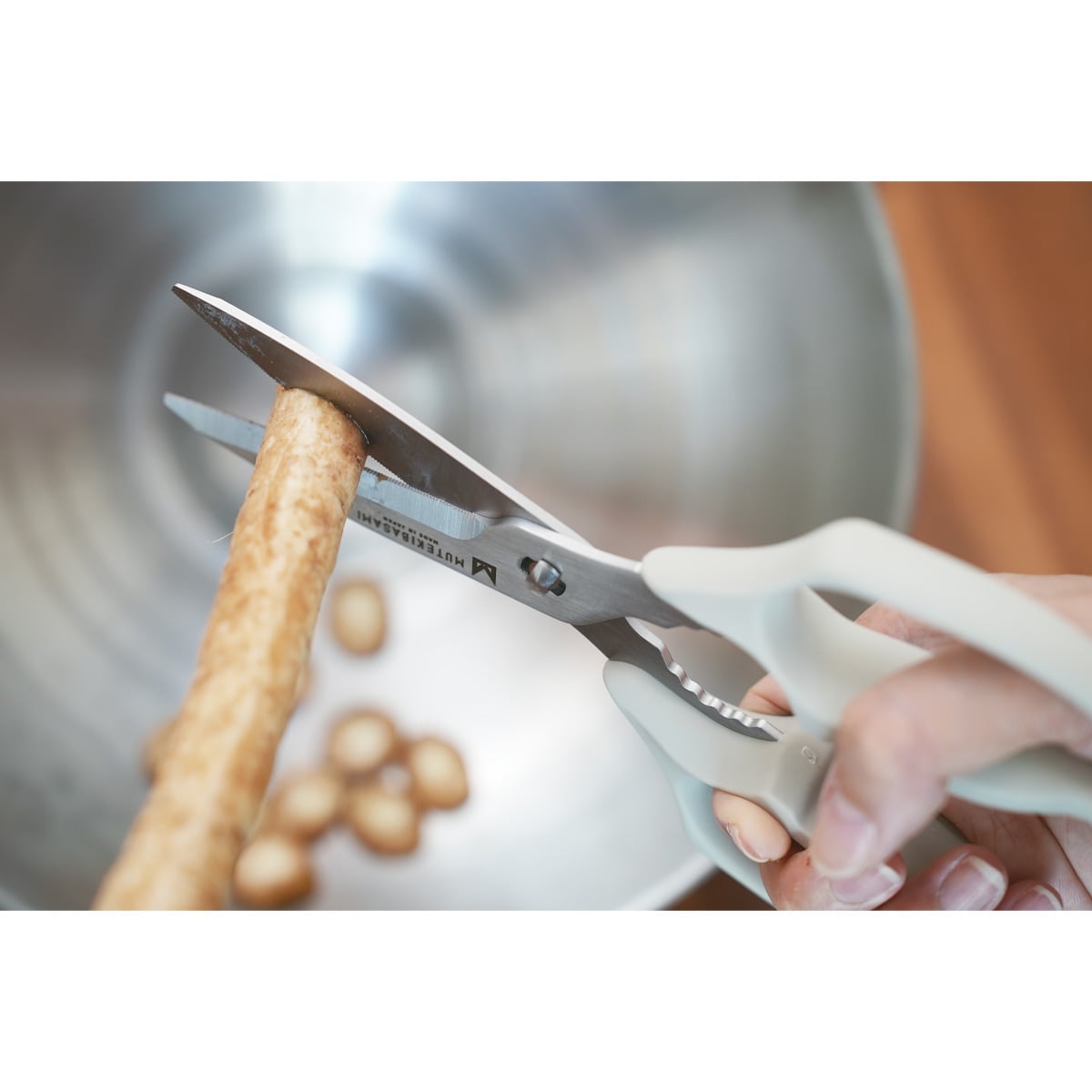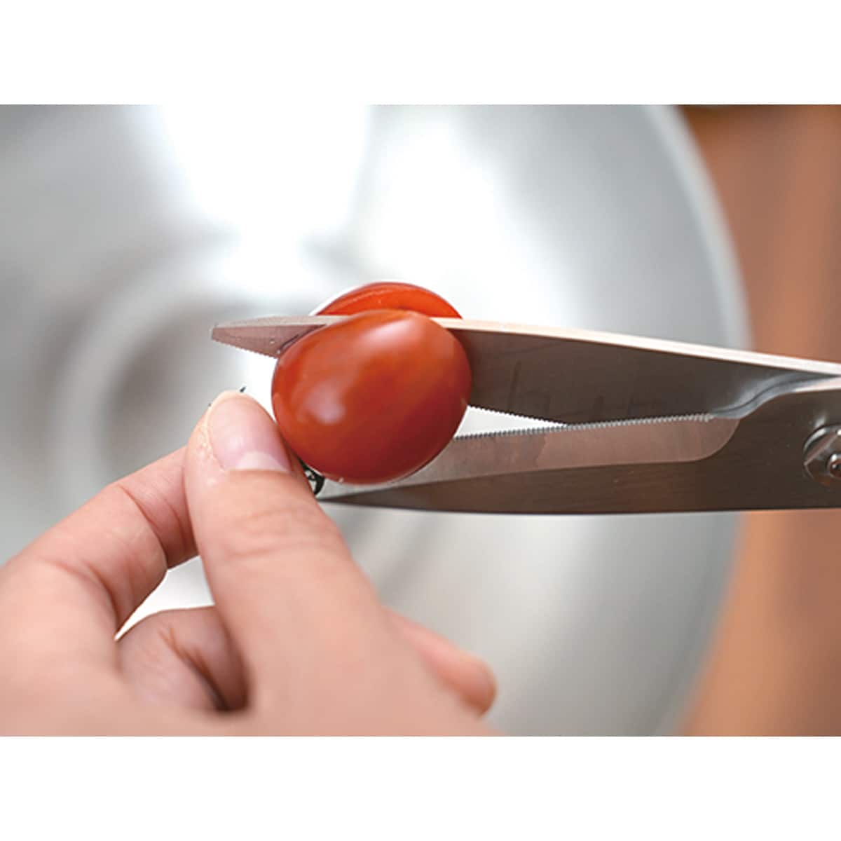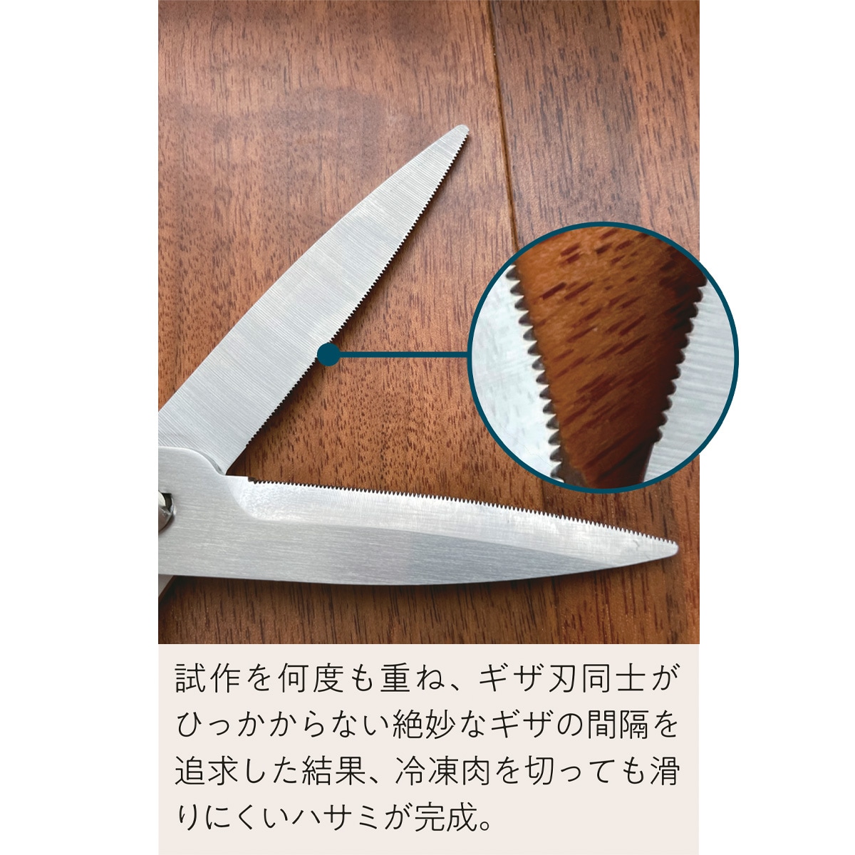 一般的なキッチンバサミは片方だけがギザ刃になっているものが多い中、両方の刃をギザ刃にすることで食材が滑らずつかめるので、スパッと切れる!