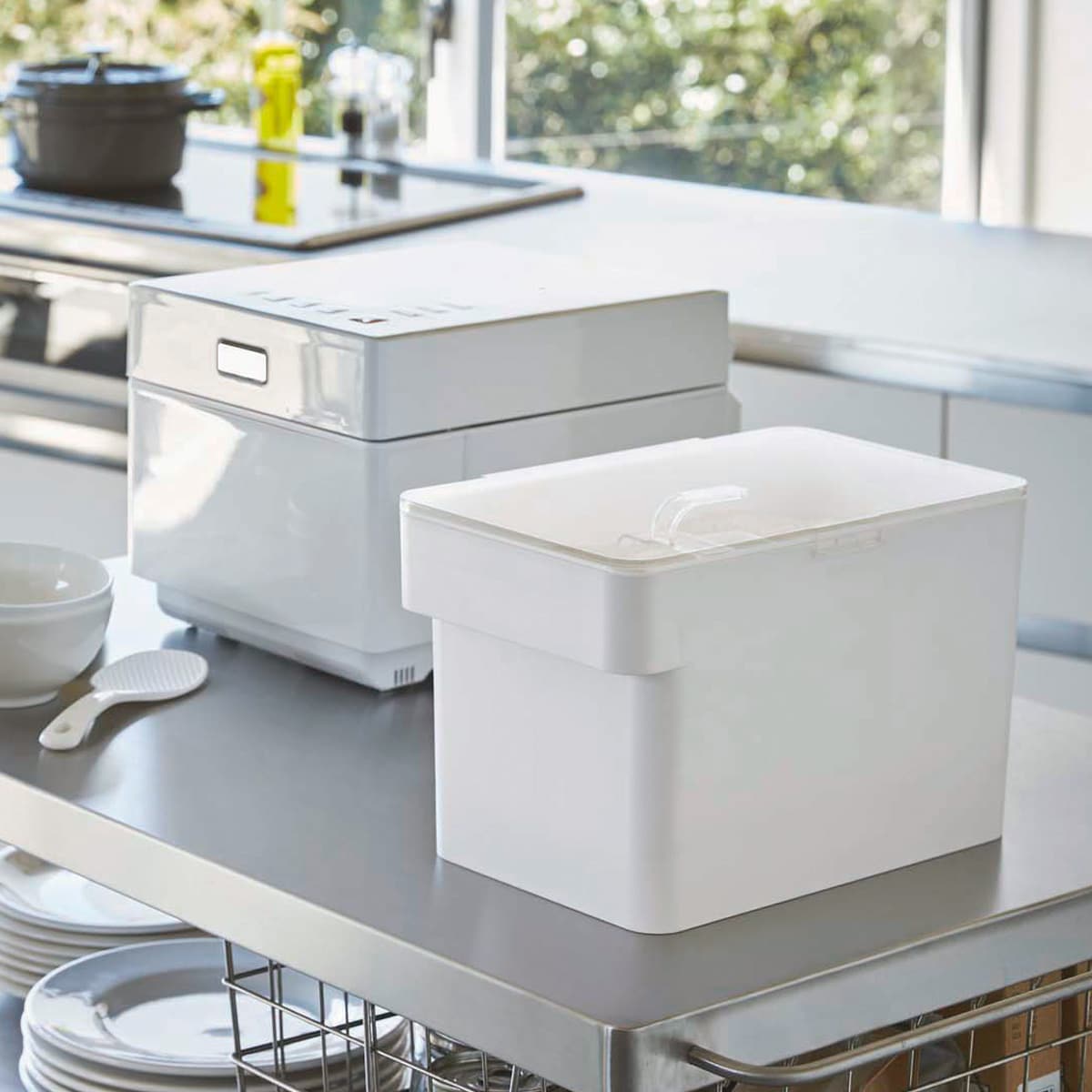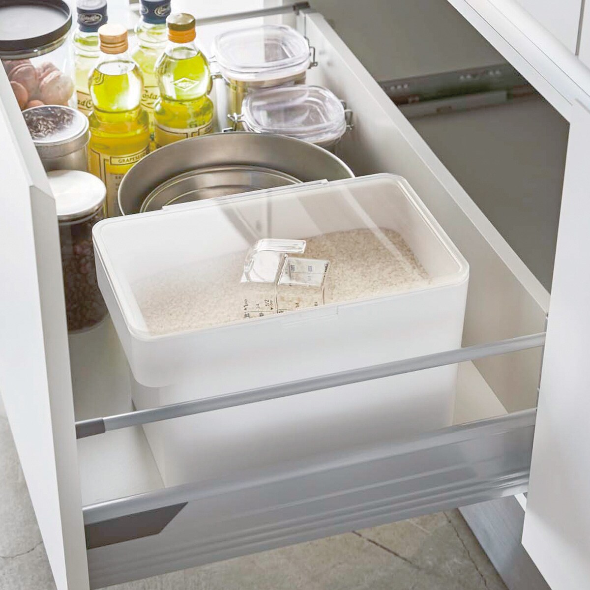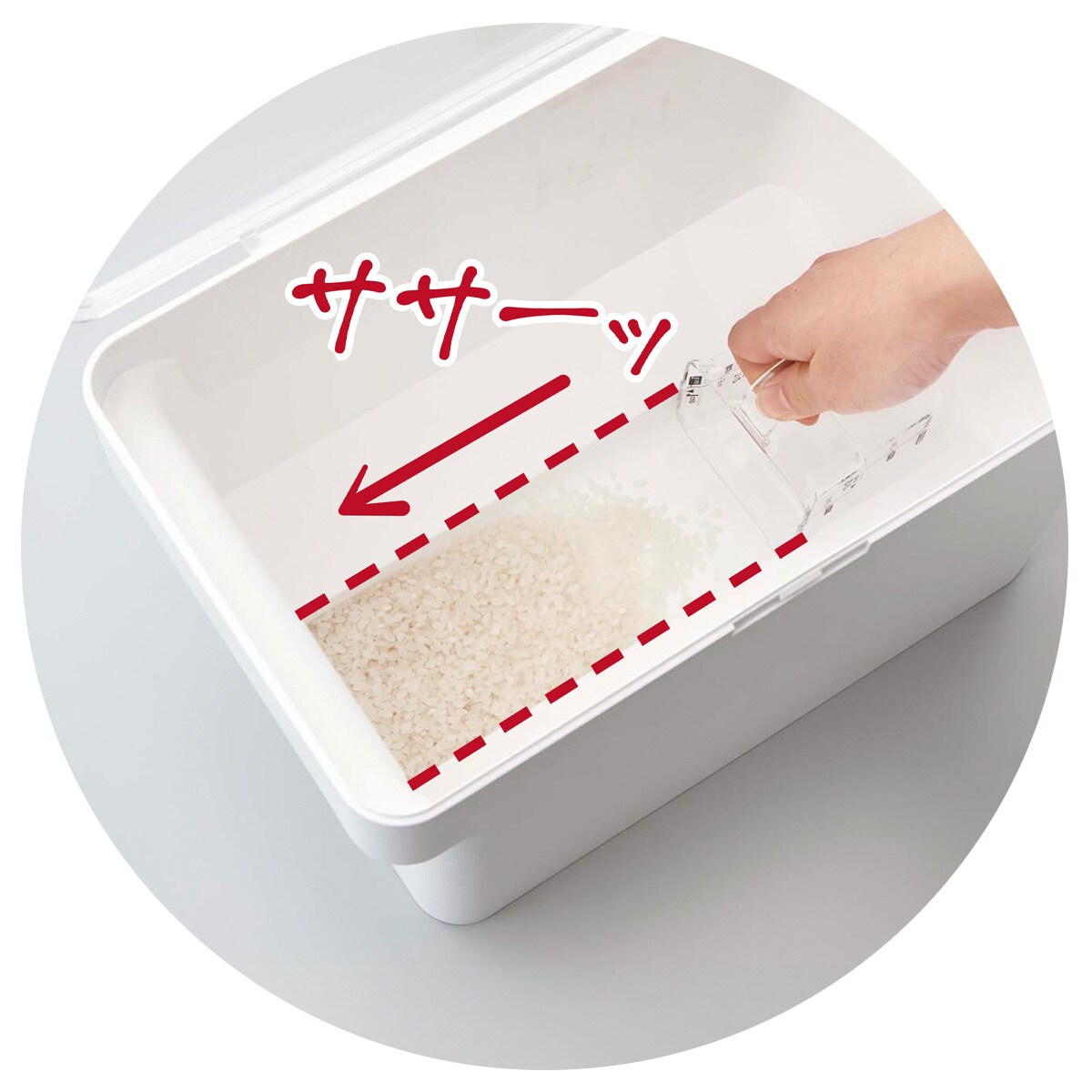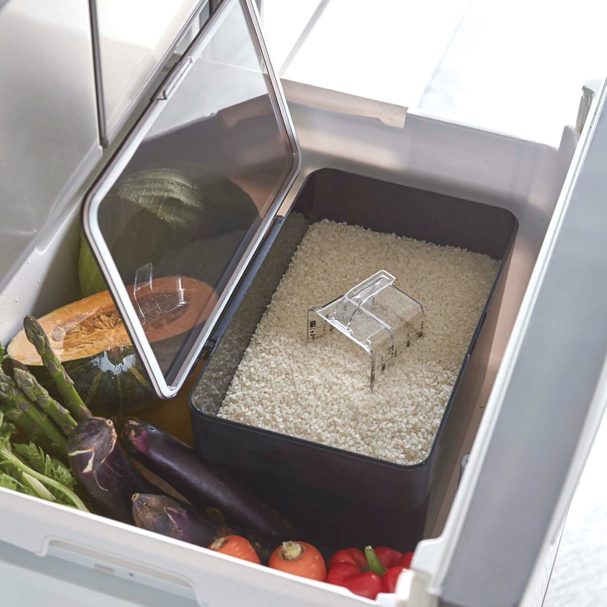 底の溝に残ったお米を付属の軽量カップでサッとすくい取れます!〈おすすめポイント♪〉・出したままでもキッチンに映えるシンプルでおしゃれなデザイン・コンパクトなのでシンク下や冷蔵庫の野菜室にもスッキリ収納・パッキン付きでしっかり密閉。お米を湿気や酸化から守ります・クリア素材でお米の残量が分かりやすい