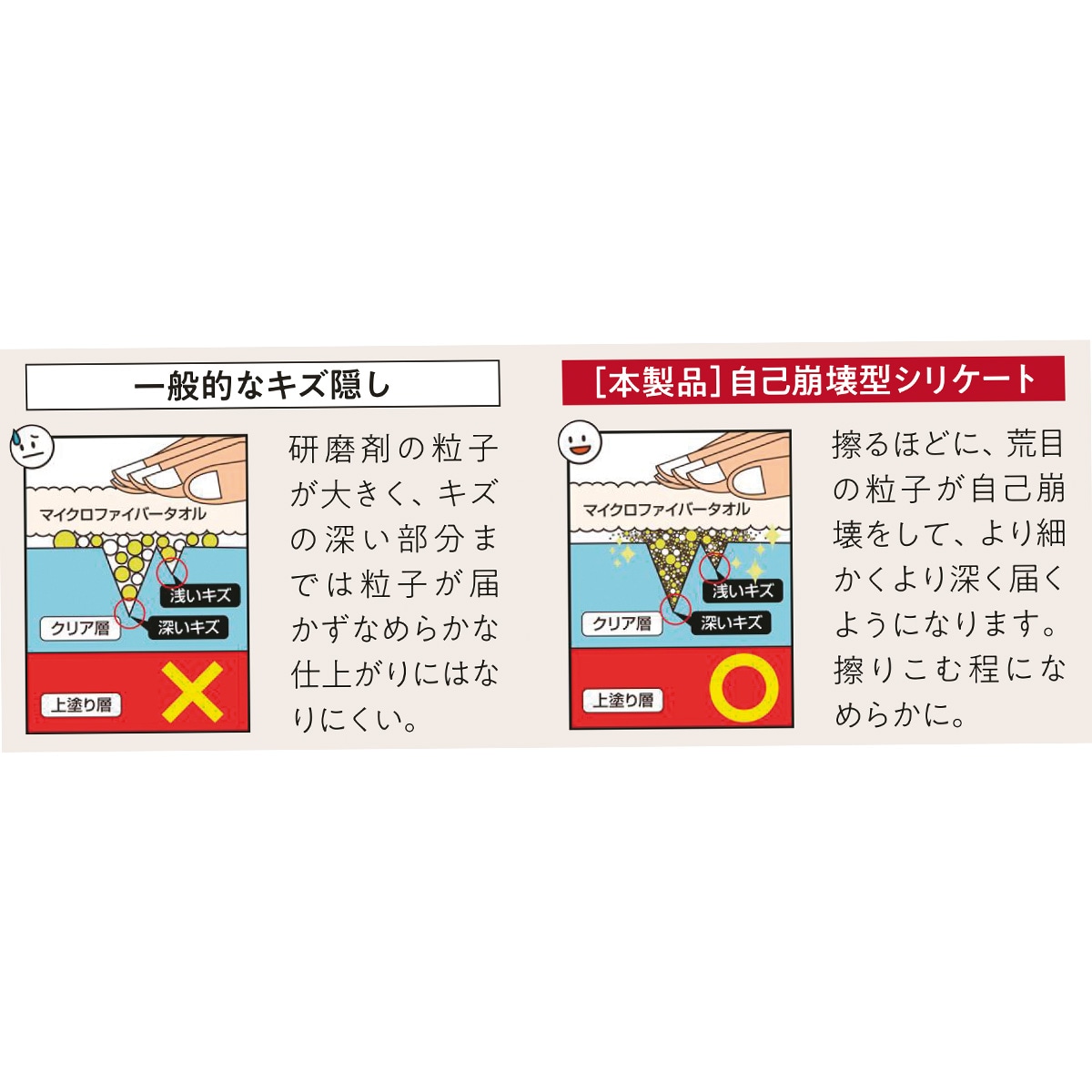 【擦るほど細かくなる粒子が傷の奥深くまで届く!】擦るほどに、荒目の粒子が自己崩壊をして、より細かくより深く届くようになります。擦りこむ程になめらかに!